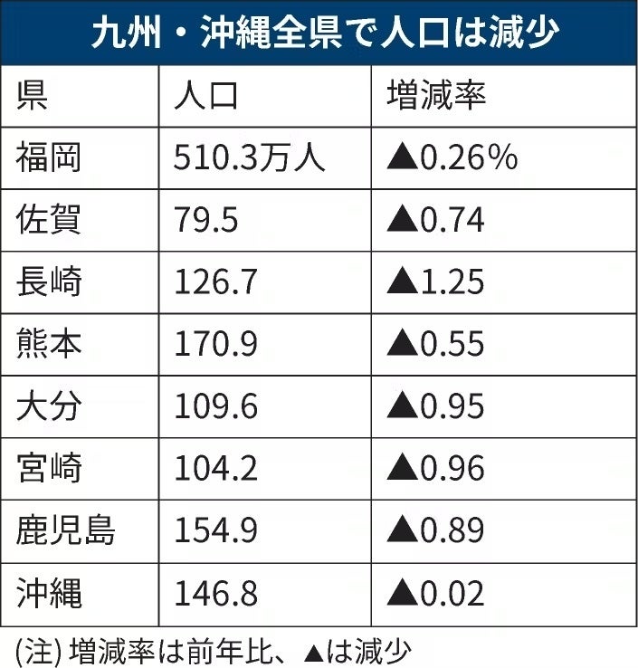 総務省の2023年人口推計によると、九州7県の人口は前年比0.6%減の1,256万人で、少子高齢化が進行しています。特に長崎県は人口減少率が1.25%と高く、顧客基盤が縮小しています。30〜49歳の働き盛り世代も2.2%減少し、人手不足が深刻化しています。※参考画像1