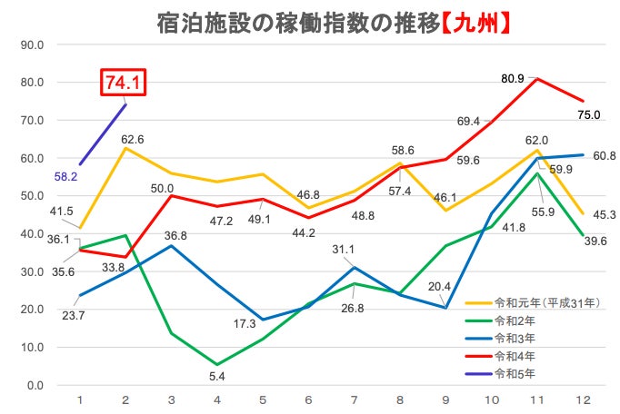 また、2023年に入り観光需要が回復基調にあります。国土交通省が発表した「九州における観光の現状について」によれば、2023年1月の外国人入国者数は前年比で+38,550.8%と大幅増加し、主な訪問者はアジア圏(韓国70.2%、台湾6.6%)からの観光客です。九州の宿泊施設稼働指数も2023年2月に74.1となり、前年同月比+40.3ポイントと大幅に改善しています。※参考画像2