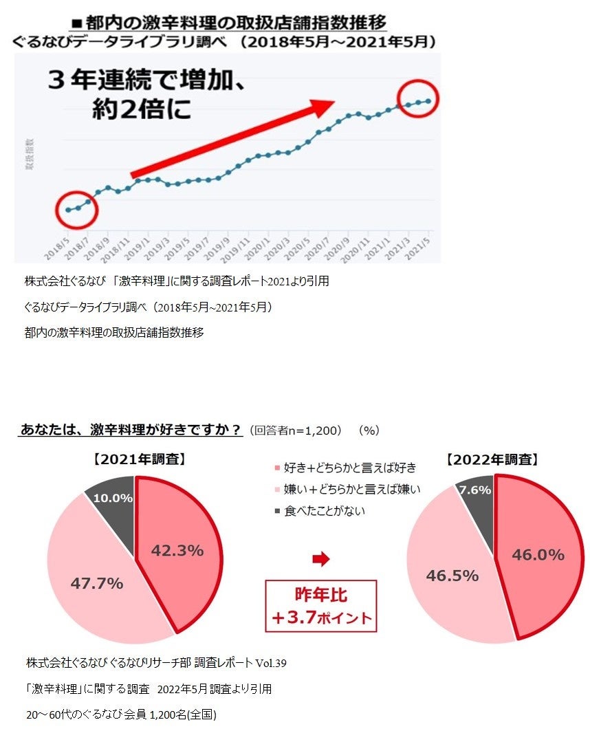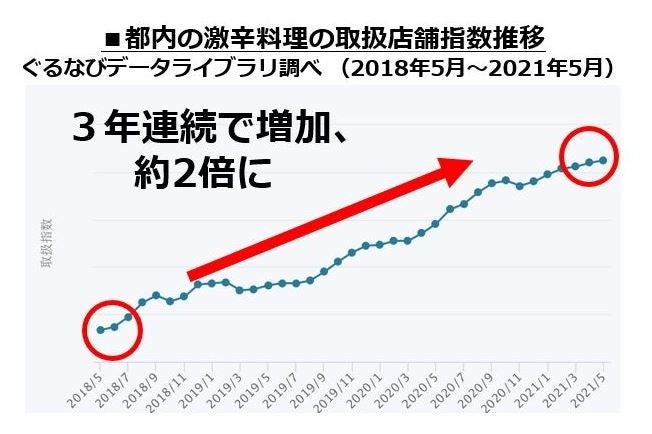 メディアでは季節問わず特集が組まれ、外食店では激辛料理を提供するお店が3年で約2倍に増加していることから