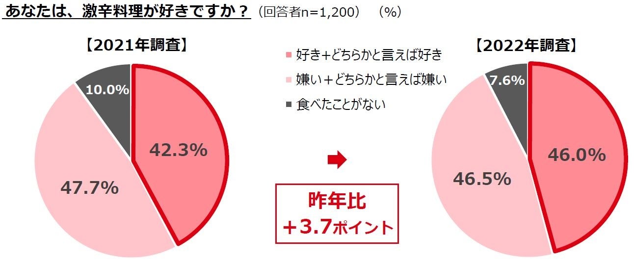 話題性が高いことが伺えます。また、激辛料理が好きな人の割合は昨年から3.7ポイント上昇していることから、