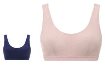 背上辺にあしらった細レースがアクセントになったシンプルなデザイン。カップサイドの2重のパーツで、寝ている間のバストの横流れを押さえます。背部はリブ素材に綿混のベア天竺素材を裏打ちしているので、なめらかでフィット感のある着けごこちです。