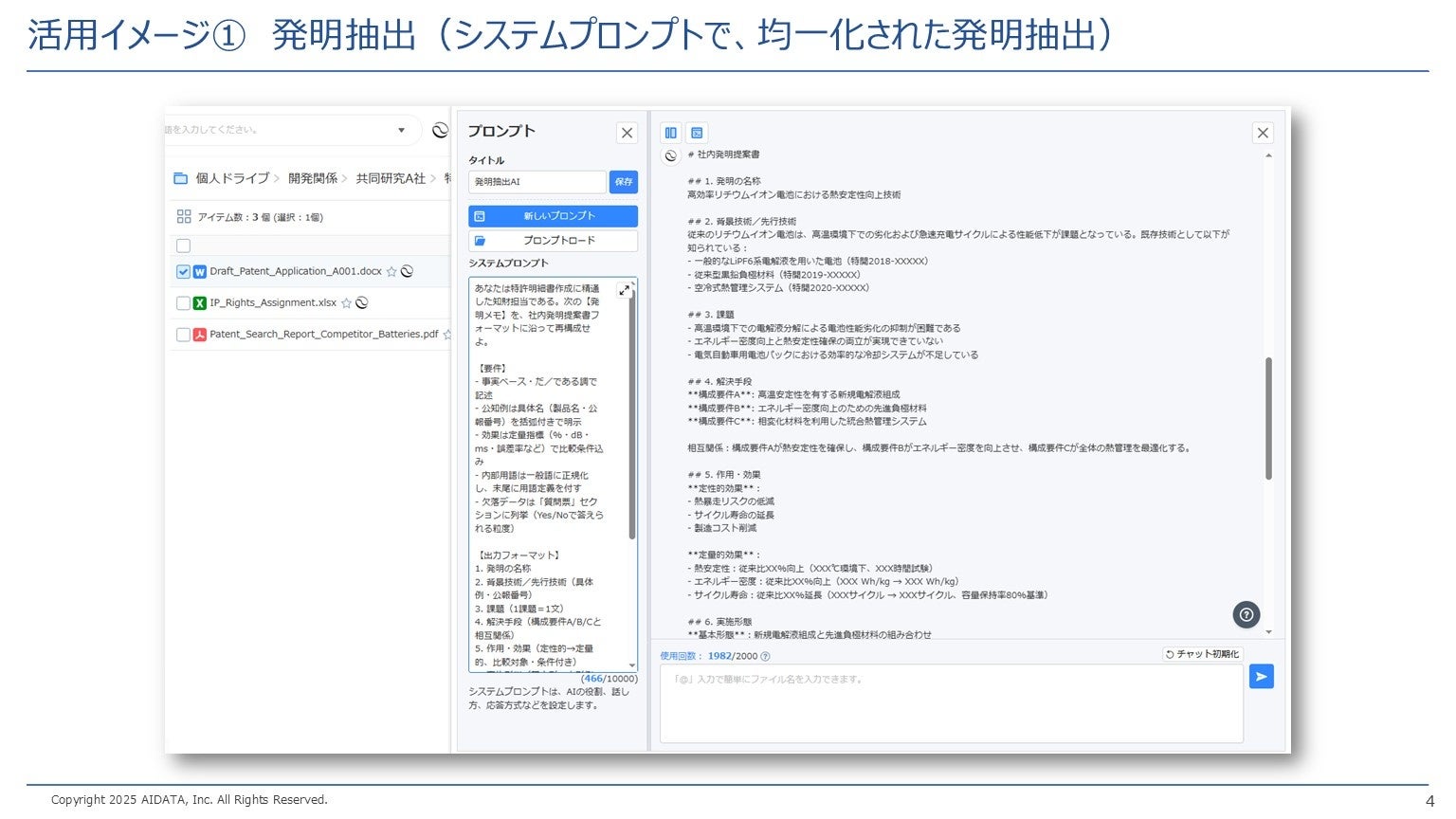 導入先からは「専門人材が不足する環境でも短期間で知財業務を効率化できる」「従来比で書類作成にかかる時間を大幅に削減できた」といった効果が報告されている。