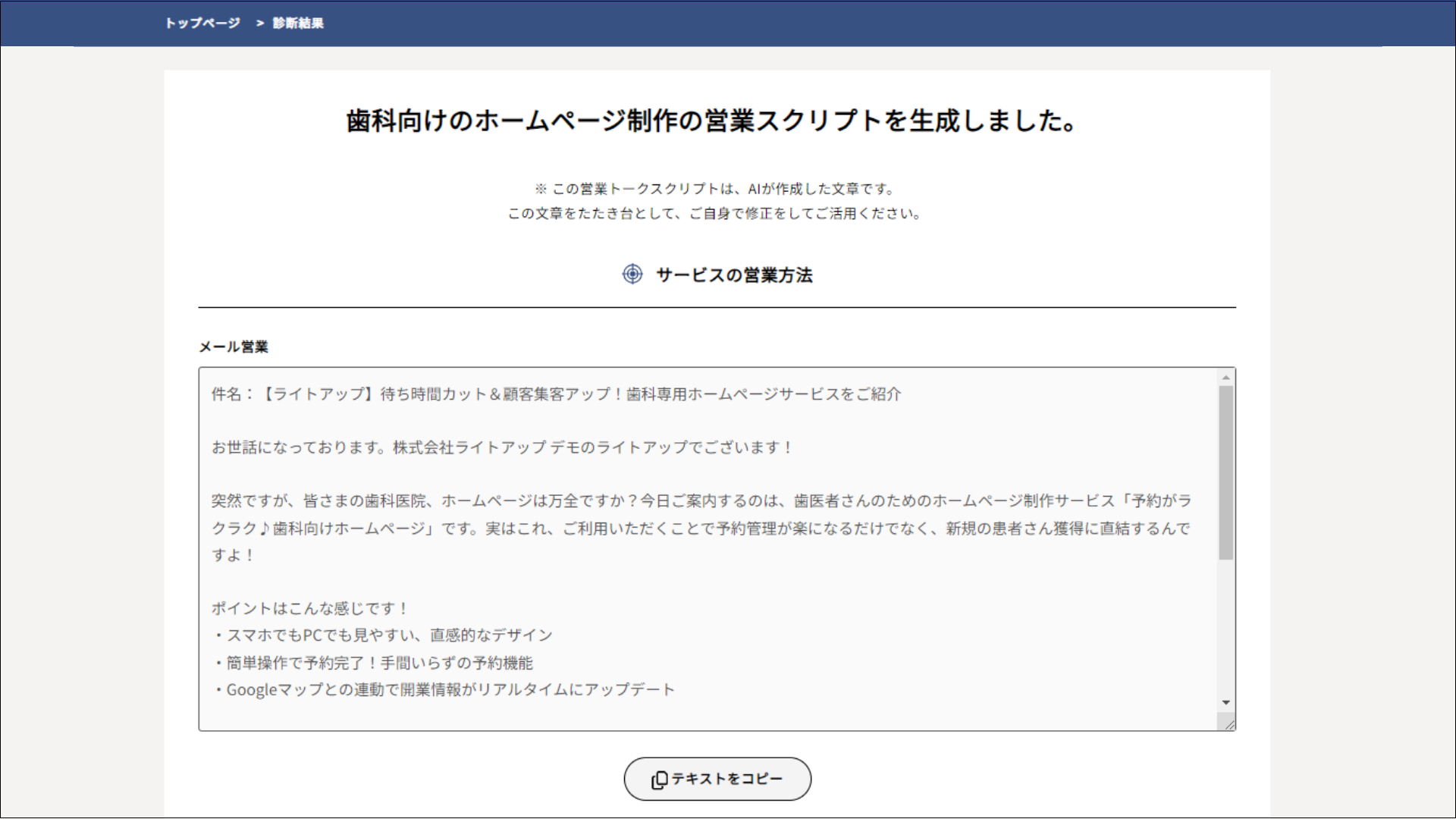 また、文面による営業の次のステップである会話によるトークスクリプトも営業支援AIでは生成可能。