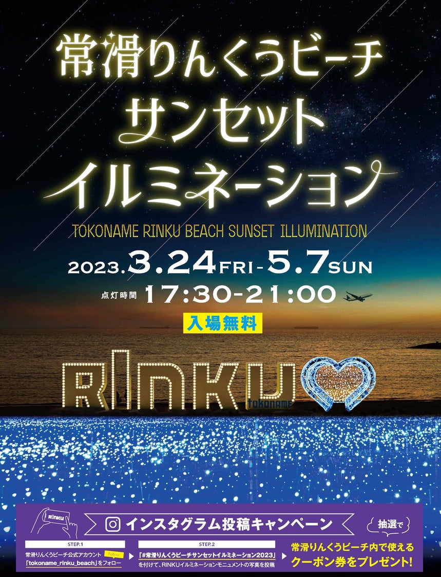 常滑市は南北15kmに渡る海岸を持ち、伊勢湾に沈む夕日がとてもきれいなまちであり、特にりんくうビーチはオレンジ色に包まれる夕日と輝く海、中部国際空港セントレアや鈴鹿山脈を望む夕日の絶景スポットとなっています。そんな夕日の絶景スポットで開催される「サンセットイルミネーション」は、さらにビーチで過ごす時間を楽しくしてくれるイベントです。