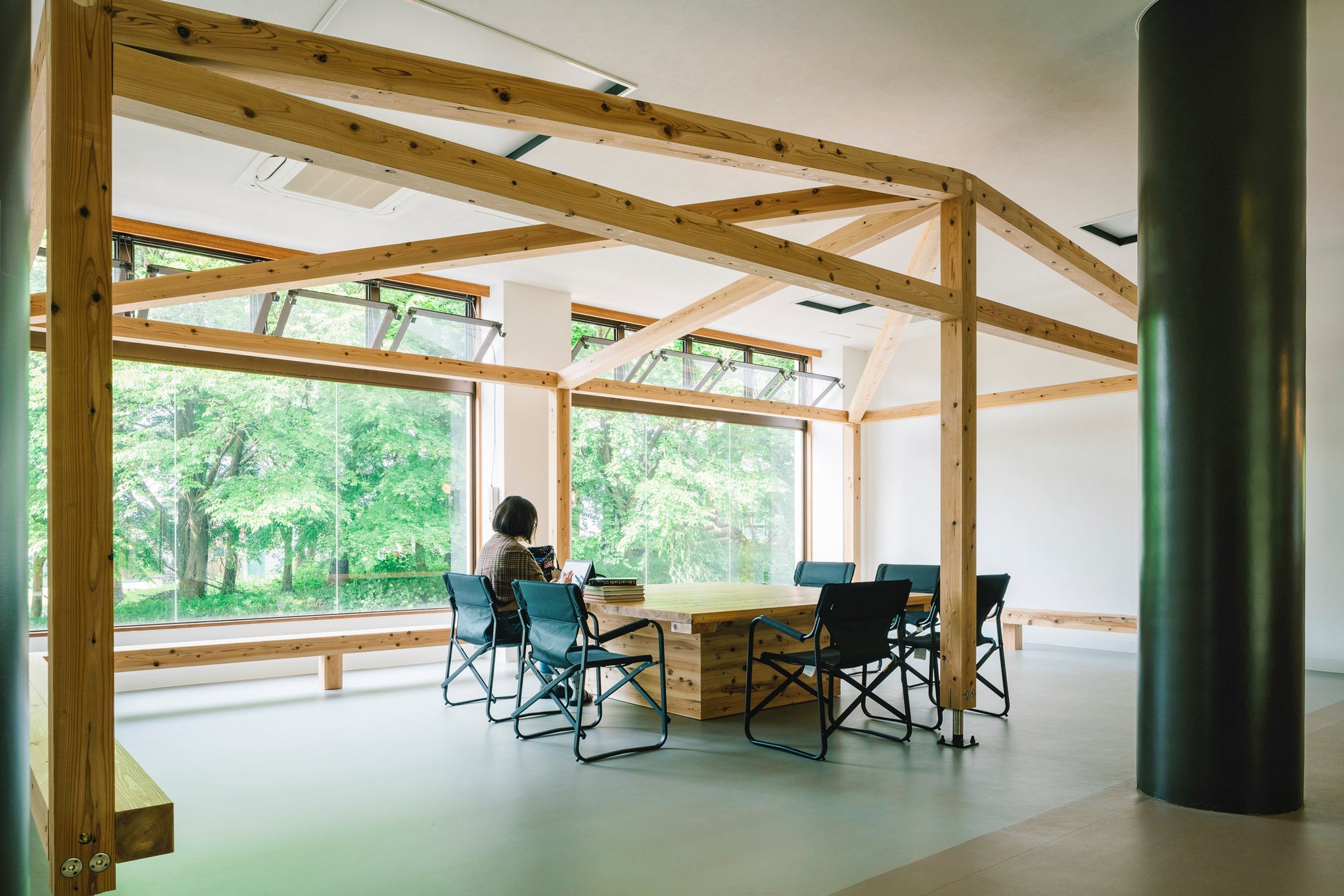 内装には地元・糸魚川産の杉材をふんだんに使用。東京オリンピック選手村で使用された後、糸魚川に戻った杉材がテーブルとして再活用されています。地域の歴史と職人の技が息づく空間が、長時間の作業でも心地よい集中を支えます。