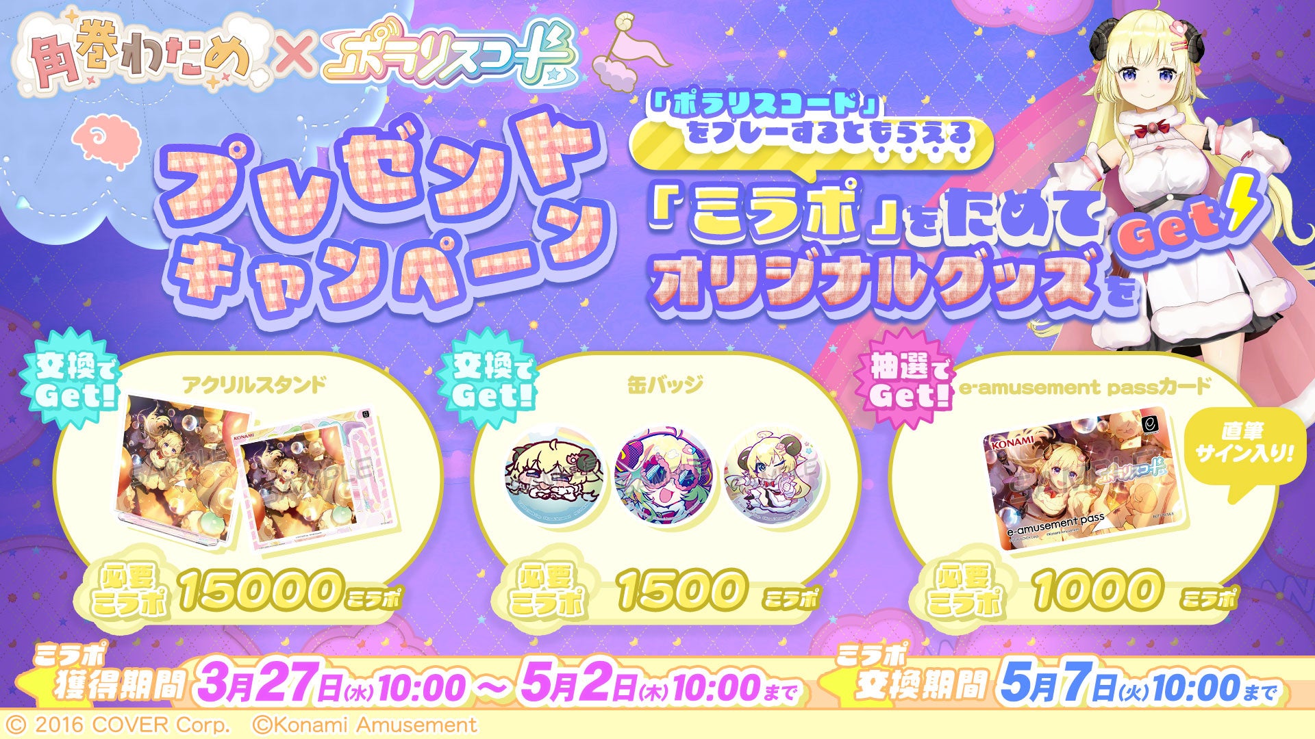 さらに、イベント期間中は『ポラリスコード』をプレーするごとに獲得できる「ミラポ」を貯めることで、「角巻わためアクリルスタンド」や「角巻わため缶バッジ」、「角巻わため直筆サイン入り e-amusement passカード」と交換できます。