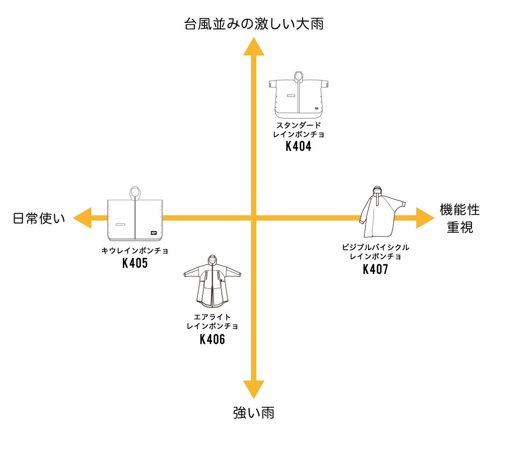 レインポンチョと一口に言っても、使用シーンや機能性はさまざま。用途に合わせた最適な一着を選ぶための「ポンチョ特性早見表」とグラフをご用意しました。
