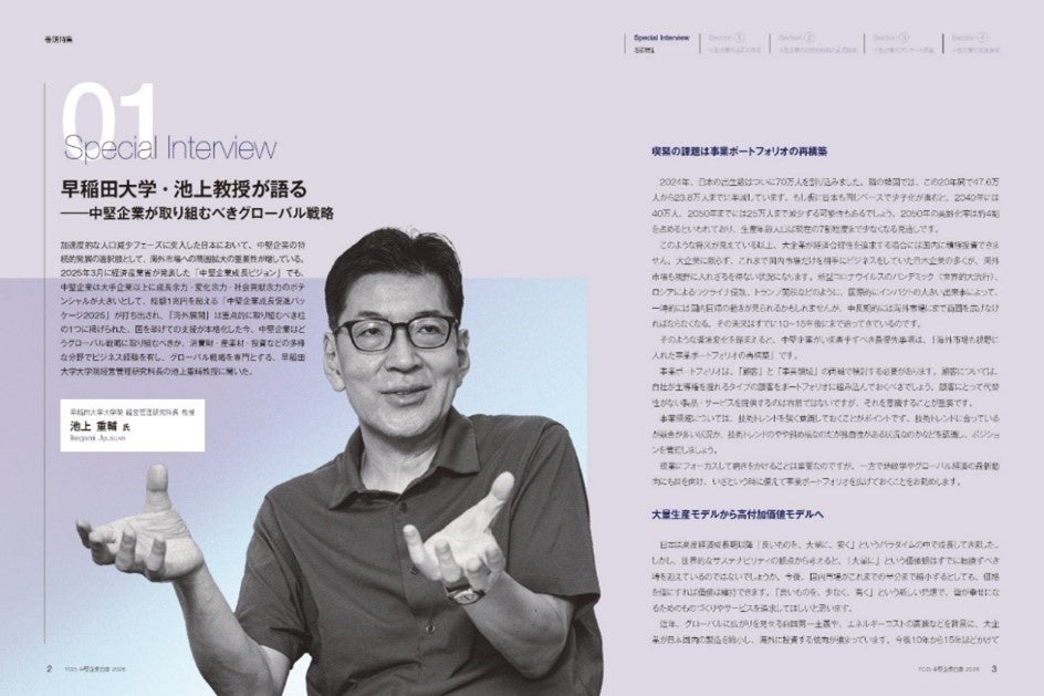 産・官・学を代表する有識者へのスペシャルインタビューを掲載いたしました。学術分野からは、早稲田大学 ビジネススクール 教授 池上 重輔 氏にご登場いただき、中堅企業が取り組むべきグローバル戦略について見解を寄せていただきました。政策推進の観点からは、経済産業省および近畿経済産業局に、中堅企業支援の最新動向を伺いました。さらに、経営の最前線の視点として、株式会社西部技研 代表取締役社長執行役員 隈 扶三郎 氏にご協力いただき、TCG代表取締役社長 若松 孝彦との対談形式で、中堅企業経営における実践的な取り組みについてお話しいただきました。