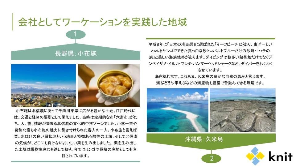 ◆当社がワーケーションを実施した地域について紹介しました。長野県の小布施、沖縄県の久米島、栃木県の那須塩原にてワーケーションを実施。テレワーク環境での孤独・繋がりの欠如を解消し、社員のエンゲージメント向上に取り組みました。
