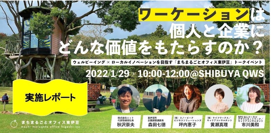 オンラインアウトソーシングサービス「HELP YOU(ヘルプユー)」を運営する株式会社ニット(本社:東京都品川区、代表取締役社長:秋沢崇夫、以下ニット)は、2015年にフルリモート前提で創業し、現在、約400人が日本全国・世界33カ国からオンラインで業務を遂行しています。このたび、令和4年1月29日(土)「ワーケーションは 個人と企業に どんな価値をもたらすのか?」をテーマに、ウェルビーイング×ローカルイノベーションを目指す 「まちまるごとオフィス東伊豆」トークイベントが開催されました。こちらのイベントに、当社の代表取締役社長である秋沢が、パネラーとして登壇いたしました。テレワークやワーケーション等に関する国の動向、企業の動向、ワーケーションのメリットを、専門的な知見からお伝えいたしました。