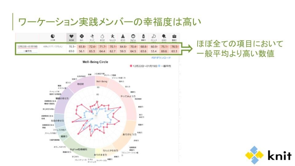◆企業がワーケーションを取り組む意義として、ワーケーションを実施したメンバーの幸福度は、高い結果になることがあげられています。ほぼすべての項目で平均値よりも高い数字になっていることを説明しました。