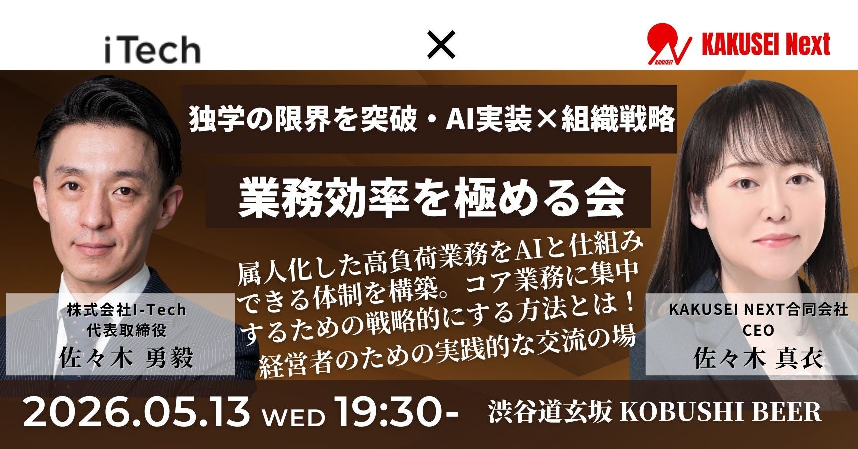 【5月13日(水)19:30~】士業・決裁者向け/独学の限界を突破し「成功率」を買う。AI実装×組織戦略で業務効率を極める会 / 主催:佐々木 勇毅(I-Tech 代表) & 佐々木 真衣(Kakusei Next CEO)