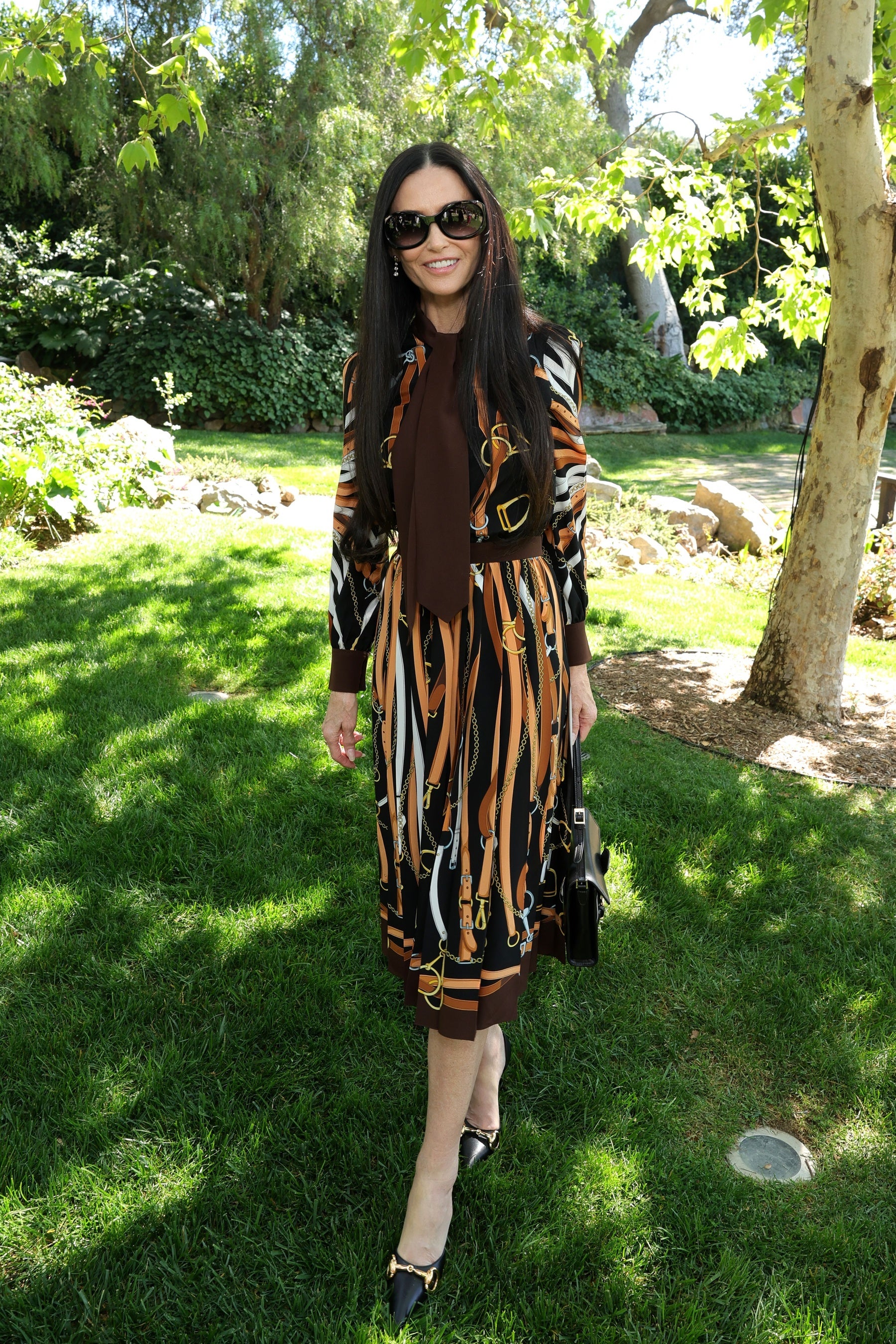 2026年3月11日、カリフォルニア州ビバリーヒルズにて開催された「98th Academy Awards Luncheon for Female Nominees」において、女優 デミ・ムーアは GENERATION GUCCIのイエロー×アイボリーのプリント シルクドレスを着用し、ブラックレザーの〔ホースビット リストレット〕ミディアム ショルダーバッグを携えて登場しました。