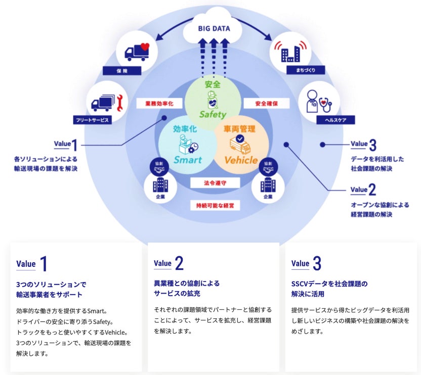 SSCVは、3つのソリューションで輸送事業者をサポートするデジタルプラットフォームです。トラックドライバーの安全確保、業務効率化、法令遵守、持続可能な経営などの輸送業界が直面しているさまざまな課題を、先進のデジタルテクノロジーとオープンな協創、そして物流会社の知見によって解決します。