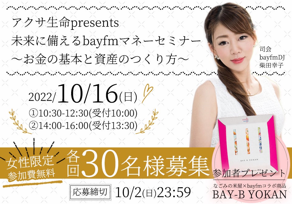 「アクサ生命presents 未来に備えるbayfmマネーセミナー~お金の基本と資産のつくり方~」を10月16日(日)に開催いたします。司会は『AWAKE』(毎週月曜日から金曜日6:00~放送)で金曜日のDJを担当している柴田幸子です。