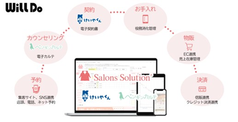 具体的には、顧客の管理、予約の管理、レジ、売上の管理、役務の管理等を行う顧客管理システム「Salons Solution」、特定商取引法対応(継続的役務提供の契約書対応)が必要な事業者向けの電子契約書作成管理サービス「けいやくん」、カルテ情報の収集・分析による顧客との共有、目標管理の共有などを可能する電子カルテサービス「ペンギンカルテ」といったエステティックサロン事業者向けのクラウドサービスを提供しております。当該サービスは、使用期間に応じて受領するサブスクリプション(月額課金)モデルで提供しており、顧客の満足度を高めるためのサポートサイトやコールセンターによる手厚いサポート体制とこれまでに培ったノウハウを活用した顧客に寄り添った運用提案を強みとしています。