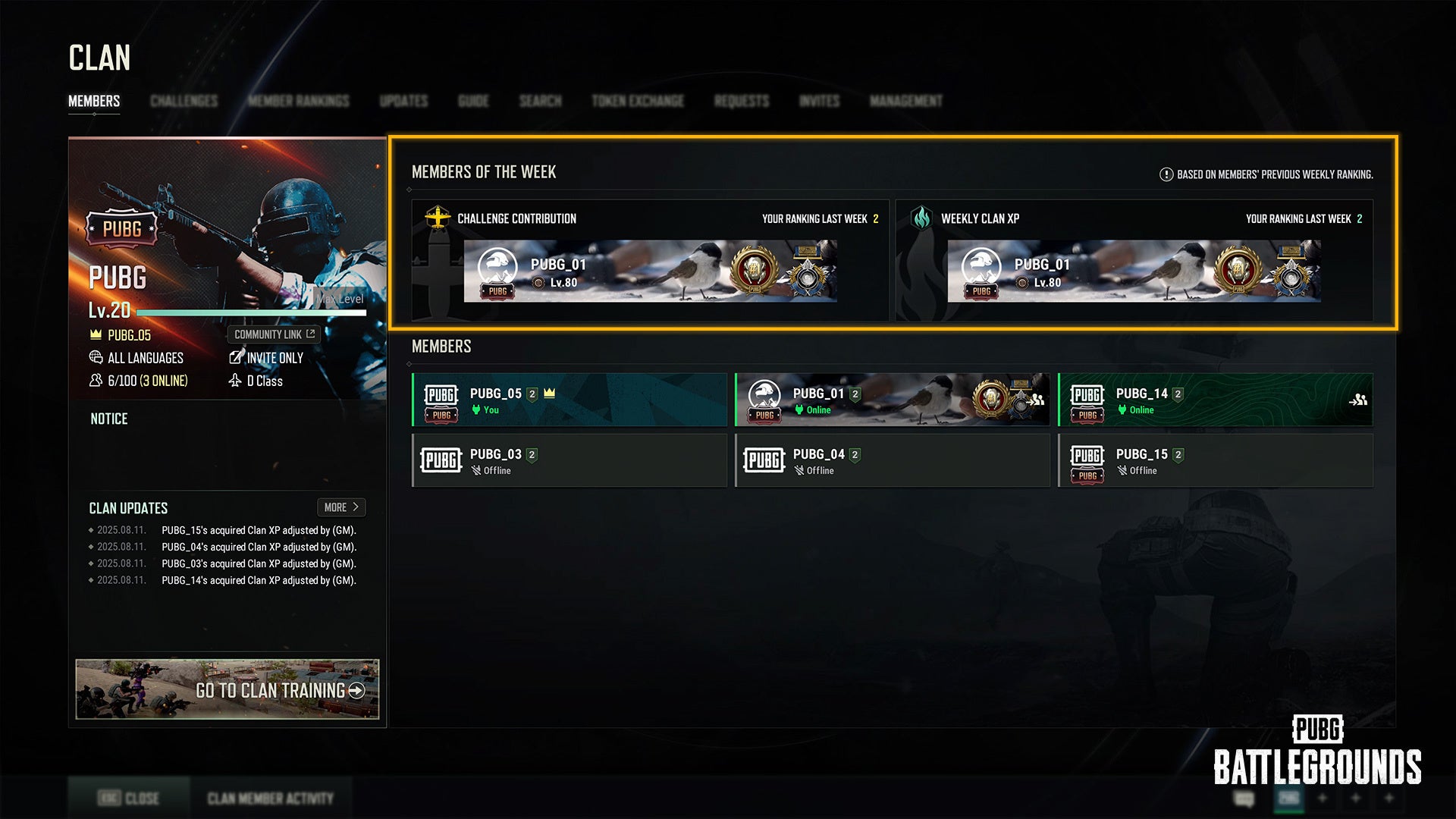 その他、クランシステムの強化も行われ、クランメンバーの週間貢献度を確認できる「クランメンバーランキング」ページが新たに追加されました。さらに、チャレンジ貢献度および週間クランXP項目ごとの1位プレイヤーが「週間クランメンバー」として選定される機能も導入されました。