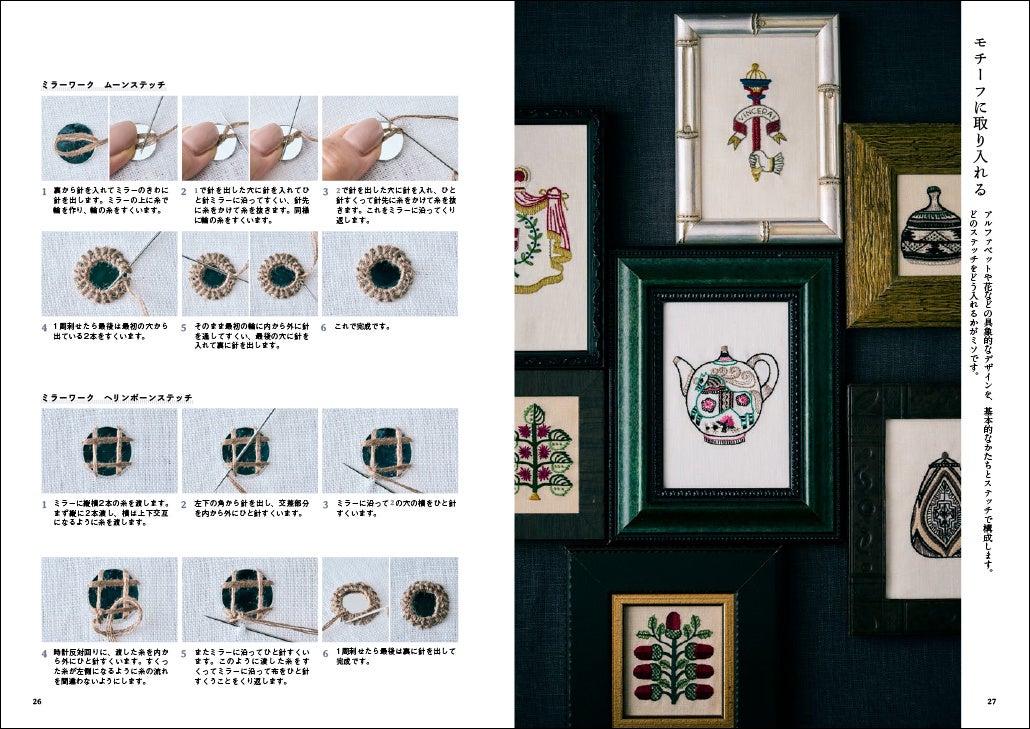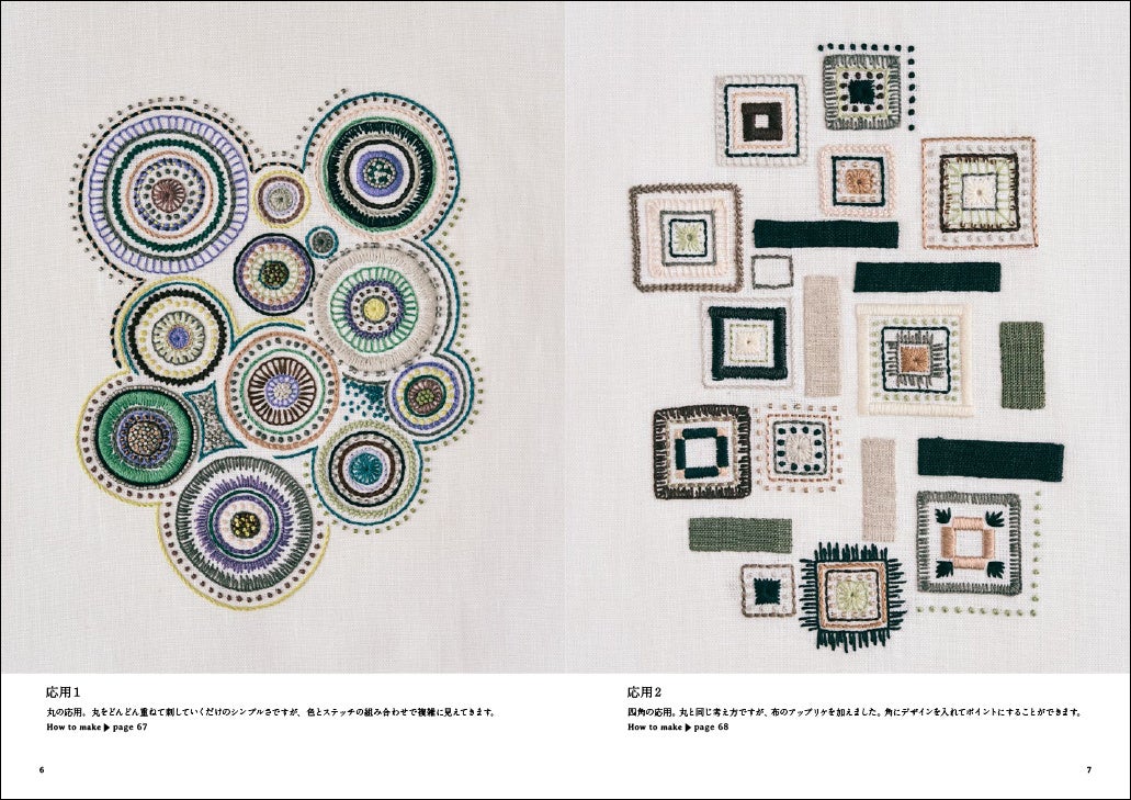 この本について/丸・四角・線の組み合わせ 応用と基本のステッチ、サテンステッチ、ロング&ショートステッチ、ブランケットステッチ、コーチングステッチ、フレンチナッツステッチ、スパイダースウェブステッチ、フィリングステッチ、ミラーワーク、アイレットワーク、パンチドワーク、刺繍の刺し方/モチーフに取り入れる アルファベット1、2、3、幸せな言葉、お皿の模様、植物、アフリカのかご、地方札トランプ、マスク、くり返し文様/小物に仕立てる カードケース、ぺたんこバッグ、リングピロー、巾着、ブローチとバレッタ、ブローチと飾りひも、日傘/道具、材料、刺繍の基本、図案と作品の作り方