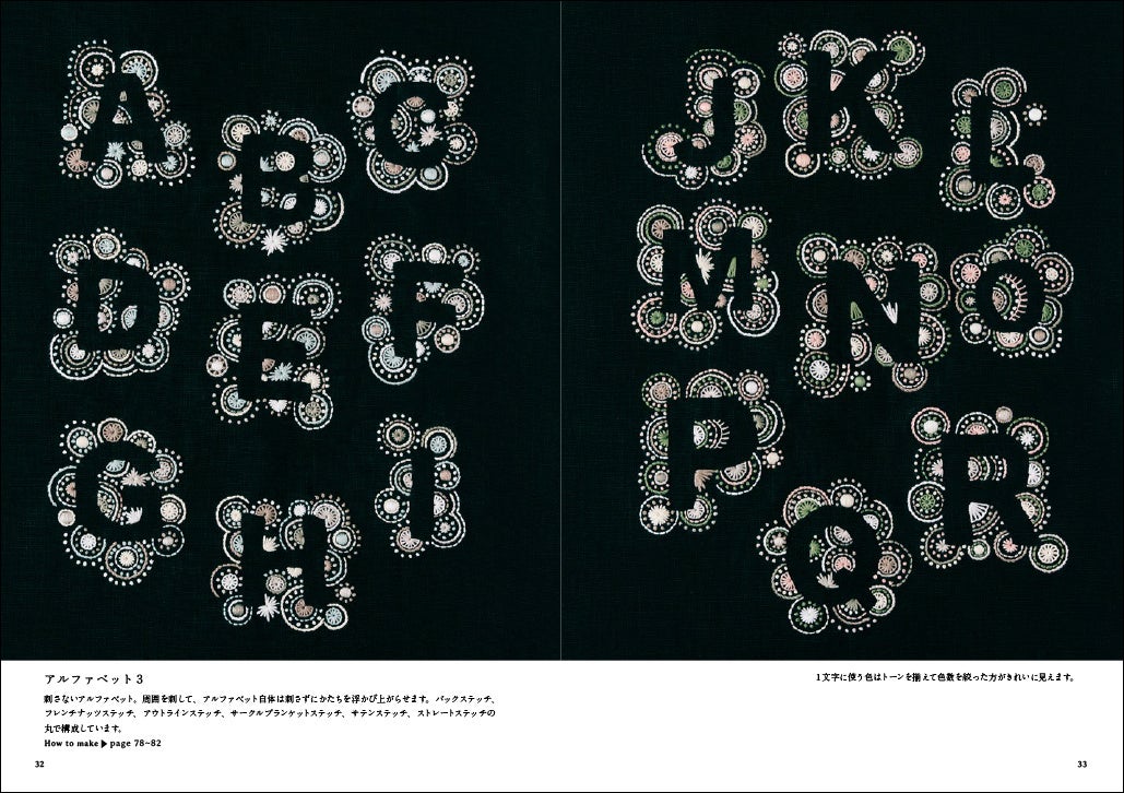 アルファベットや花などの具象的なデザインを、基本の幾何学模様ステッチで構成する楽しい図案も。