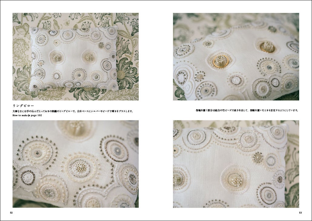 リングピロー、バッグ、ブローチ、日傘など、シンプルなステッチを効果的に生かした小物づくりも。