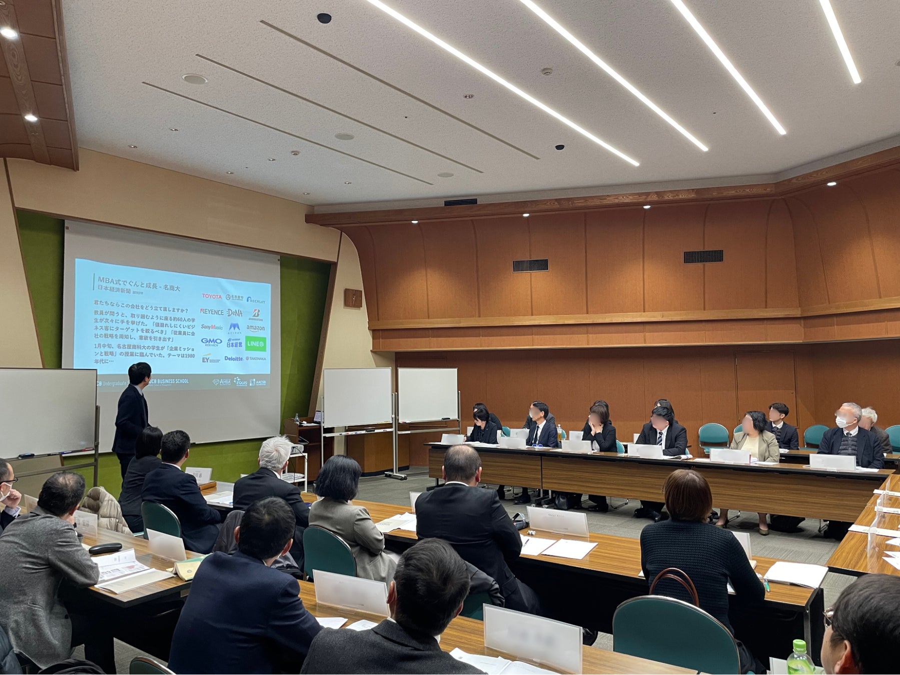 名古屋商科大学が担当した午後の部では、世界の大学教育で重視される「教育の質」の評価指標や、世界三大国際認証について紹介。続いて、後半には本学が導入している実践型授業「ケースメソッド」を、実際の教材(ケース)を用いて体験していただきました。先生方にはケースを読んだうえで生徒役として意見を発表していただき、重大な意思決定に直面したケース内の主人公になったつもりで、活発な議論が展開されました。白熱した意見交換を経て、ケースから得られる学びをクラス全体で整理し、授業の総評へとつなげています。さらに、ケースメソッドにおける参加者の評価指標の例も提示し、具体的な授業実践に生かすためのポイントを共有しました。
