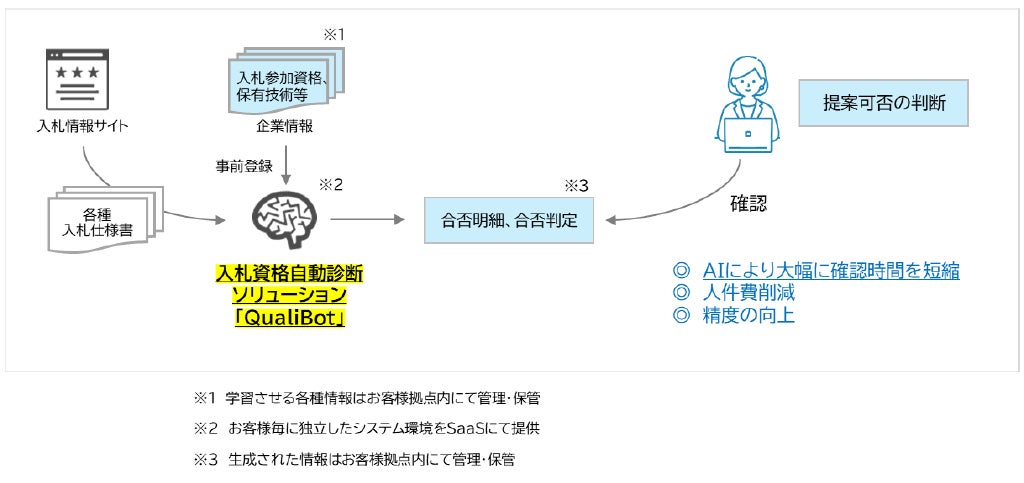 本セミナーでは、入札案件提案の効率性や生産性を向上するために、担当者の負担軽減、合否判定時間の短縮および合否判定結果の精度向上に役立つ入札資格自動診断ソリューション「QualiBot」の活用方法について、その特徴や事例を交え、解説します。