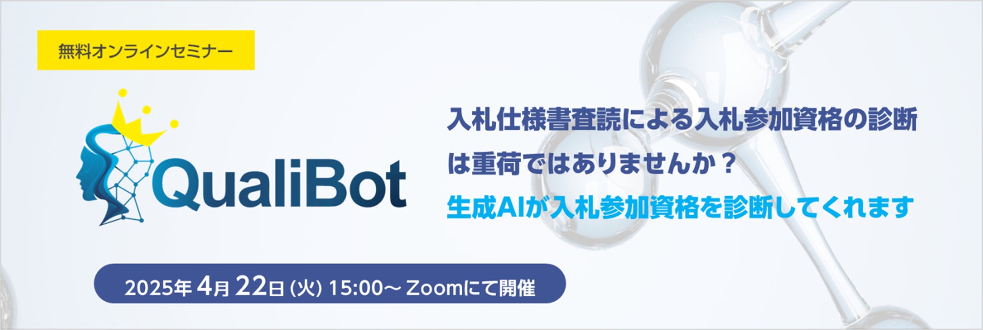 株式会社ニーズウェル(本社:東京都千代田区、代表取締役会長兼社長 船津浩三)は、2025年4月22日(火)15時より、無料オンラインセミナー「入札資格自動診断ソリューション「QualiBot」 ~入札仕様書査読による入札参加資格の診断は重荷ではありませんか? 生成AIが入札参加資格を診断してくれます~」を開催します。