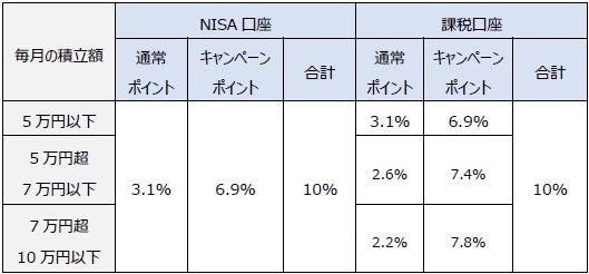積立額 100 円につき 3 ポイント(3%ポイント進呈)、さらに1,000 円ごとに1ポイント(0.1%ポイント進呈)がたまります。