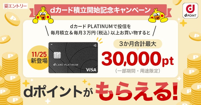 ※「d カード PLATINUM」を使用して1か月の上限額の10万円分の「dカード積立」を行うと、通常ポイントと合わせて積立額の10%分の10,000 ポイントが進呈され、3か月連続で条件を満たすことで最大30,000ポイントが進呈されます。