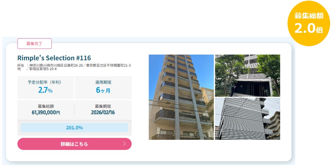 プロパティエージェントの展開する不動産クラウドファンディングRimple’s Selection#116募集総額201%の1.23億円の応募