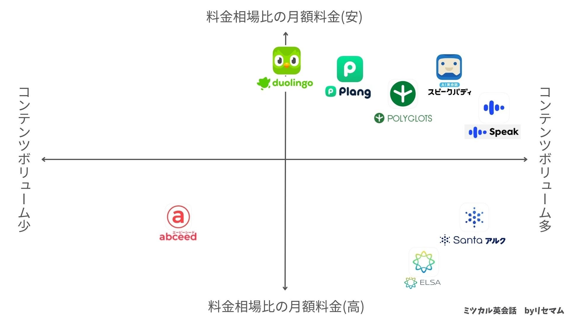 縦軸:英語学習アプリの料金相場に対して安い ⇔ 高い