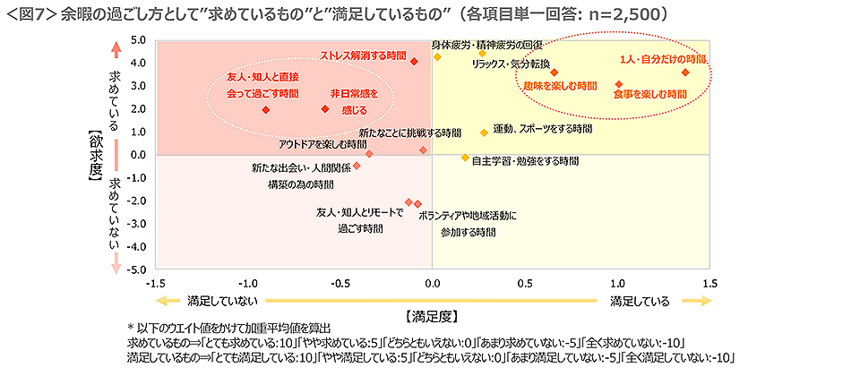 余暇の過ごし方として“求めているもの”と“満足しているもの”の結果<図7>をみると、求めていて満足しているものは「1人・自分だけの時間」「食事を楽しむ時間」「趣味を楽しむ時間」など。一方、求めているが満足していないものは、「友人・知人と会って過ごすための時間」「非日常感を感じる時間」などであった。