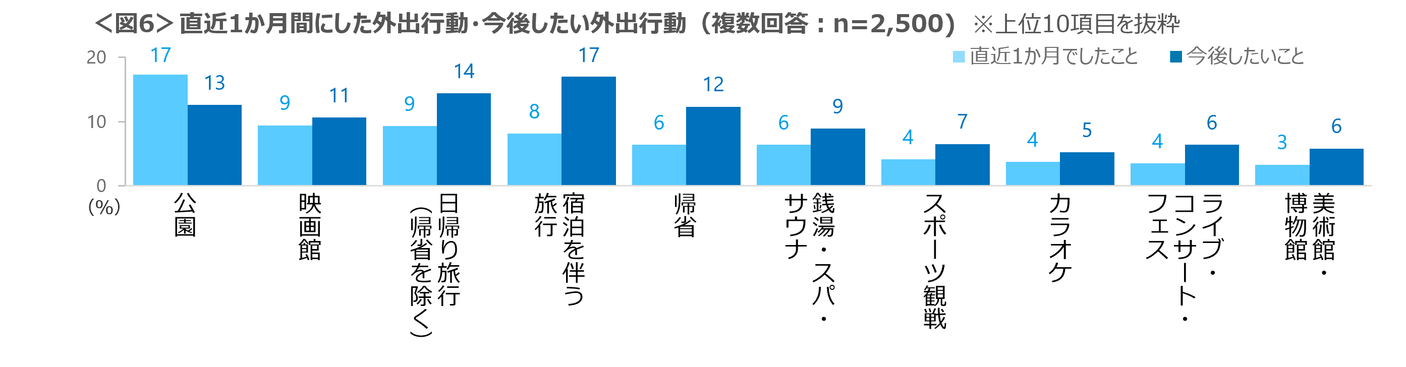 ”直近1カ月間に行った外出先”は「公園」「映画館」「日帰り旅行」が高い。“今後行きたい外出先”は「宿泊を伴う旅行」「日帰り旅行」「公園」「帰省」などが高い。<図6>