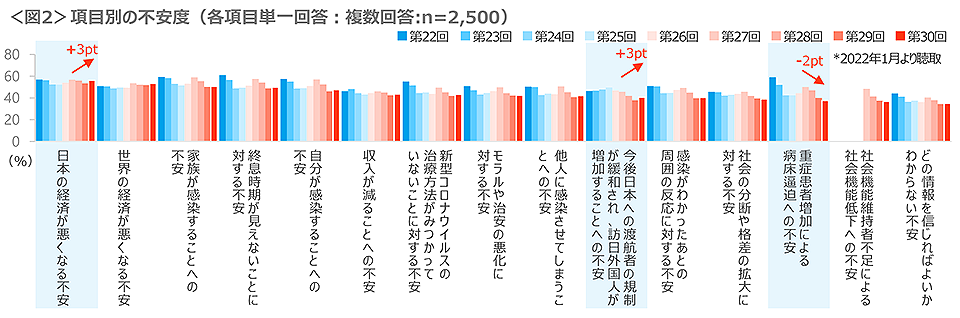 項目別の不安度もおおむね先月同様の結果である。微増減があったのは「日本の経済が悪くなる」「今後日本への渡航者の規制が緩和され、訪日外国人が増加する」が3p増、「重症患者増加による病床逼迫」は2p減のみである。<図2>