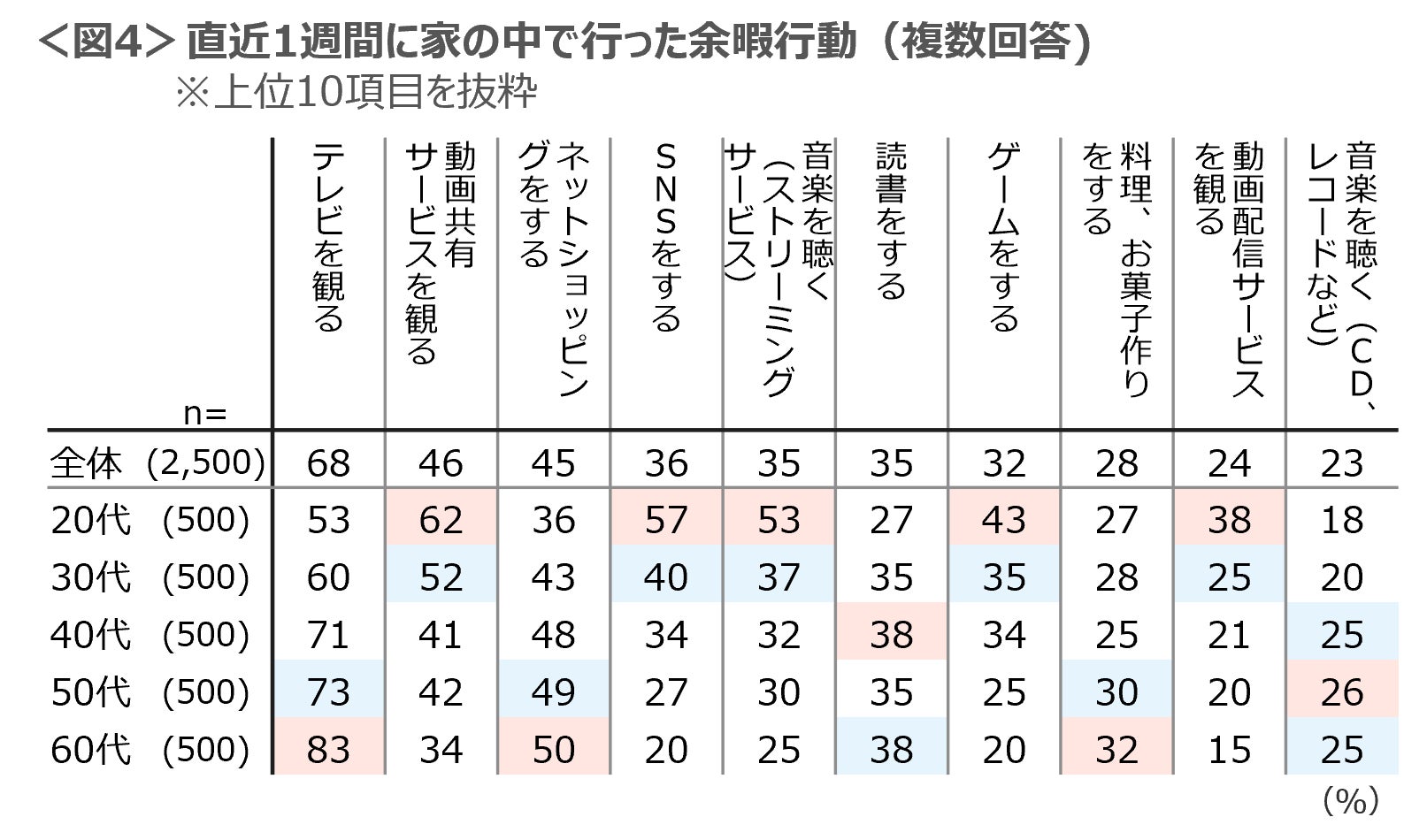 家の中での余暇で直近1週間で行ったことは「テレビを観る」「動画共有サービスを観る」「ネットショッピングをする」「SNSをする」「音楽を聴く」「読書をする」が上位。若い世代は、動画共有サービスやSNS、音楽を聴く行動、中高年はテレビの視聴やネットショッピングが高かった。読書のジャンルは「文芸」「マンガ」「雑誌」が多く、中でもマンガは、「紙の書籍」よりも「電子・ネット書籍」で読まれているケースが目立つ。<図4、5>