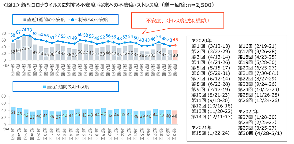 定点指標の「直近1週間の不安度」は微減の30%、「将来に対する不安度」は2p増の45%、「直近1週間のストレス度」は、微減の40%といずれも先月と大きな変わりはなかった。<図1>
