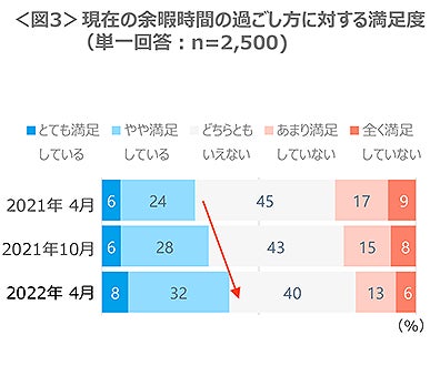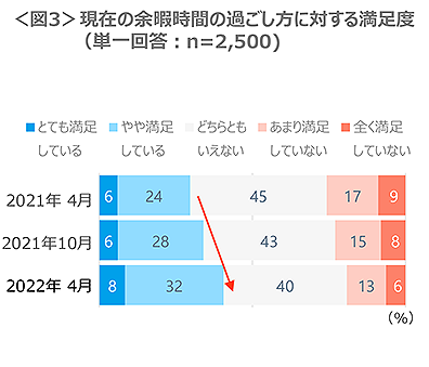 余暇時間の過ごし方の満足度(とても+やや満足している)は41%、1年前や半年前の調査結果と比べ上昇した。<図3>