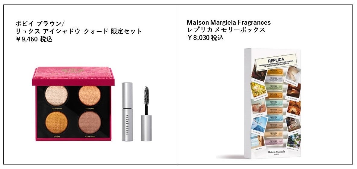 豊かな発色と煌めく輝きで人気のボビイ ブラウン 「リュクス アイシャドウ クォード」 が限定復刻。 また、過去にも即完売となったメゾン マルジェラ フレグランス「レプリカメモリーボックス」が今年も復刻。ブランドの代表的なフレグランスのミニボトルが10本セットになった特別な限定ボックスです。