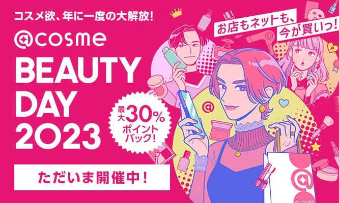 株式会社アイスタイル(代表取締役社長:遠藤 宗)は、@cosmeの公式通販「@cosme SHOPPING」、@cosmeのフラッグシップショップ「@cosme TOKYO」「@cosme OSAKA」、コスメセレクトショップ「@cosme STORE」及び「東京小町」、「シドニー」各店※にて、本日、2023年12月1日(金)から12月3日(日)までの3日間、年に一度のコスメ祭「@cosme BEAUTY DAY」を開催いたします。