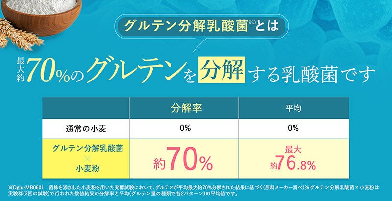 ※3 「Dglu-MB0601」菌株は、グルテンを分解する能力を持つ乳酸菌として、韓国特許を取得しています。(特許公開番号:10-2019-0142263)