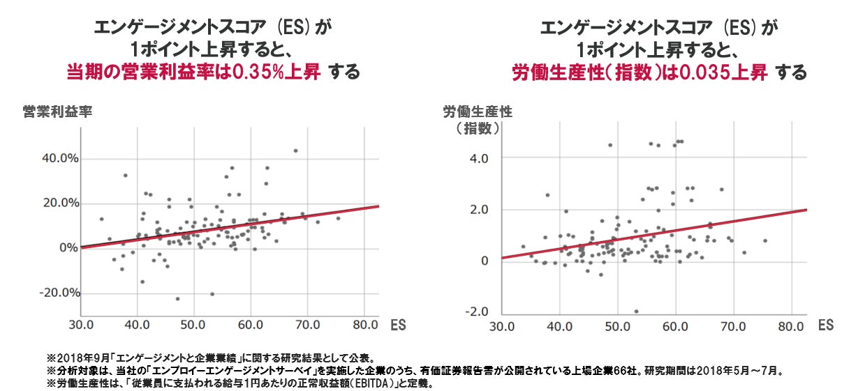 すでに、慶応義塾大学との共同研究によって、「エンゲージメントが高ければ営業利益率、労働生産性にプラスの影響をもたらす」といった相関性が明らかになっており、その研究データは、経済産業省による「持続的な企業価値の向上と人的資本に関する研究会 報告書 ~人材版伊藤レポート~」にも掲載されています。