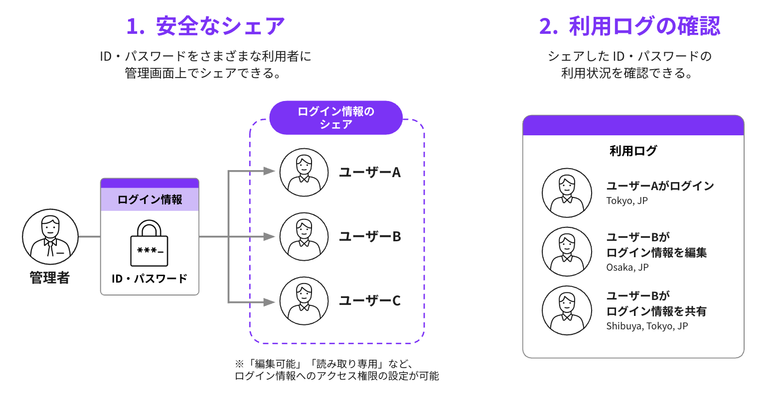 ユーザー権限の細分化:各ユーザーに対して、「編集可能」「読み取り専用」など、役割に応じた、ログイン情報へのアクセス権限の設定が可能です。