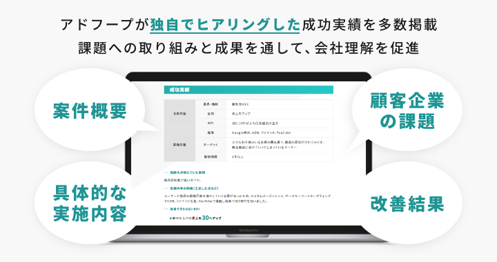 今後もアドフープは、掲載企業数の拡大に注力すると共に、Webマーケティング領域の垣根を超えた新たな領域でのサービス提供を通して、企業のマーケディング活動の効率化と事業成長を支援してまいります。