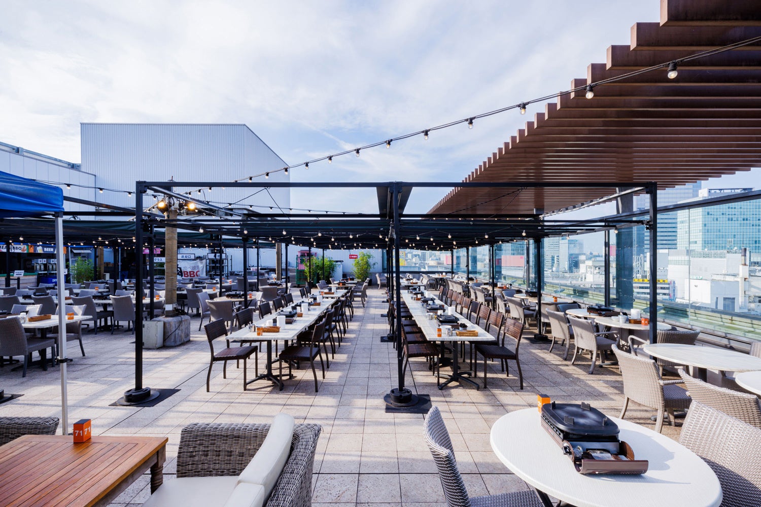 お肉だけでなく種類豊富な食べ放題・飲み放題メニューをご用意。ファミリーやカップル、お子様まで、お仕事帰り、ショッピングの後など様々なシーンでご利用いただけます。屋上にありながら一部屋根付きエリアも備えられた全天候型バーベキュー施設です。