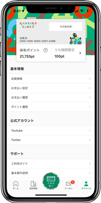 本アプリご利用のキャッシュレスでのお買物100円(税込)につき、カメクロポイントが1ポイント付与されます。カメクロポイントは1ポイント=1円として、1ポイントから「カメイドクロック」でのお買物で使用できます。(一部対象外店舗あり)