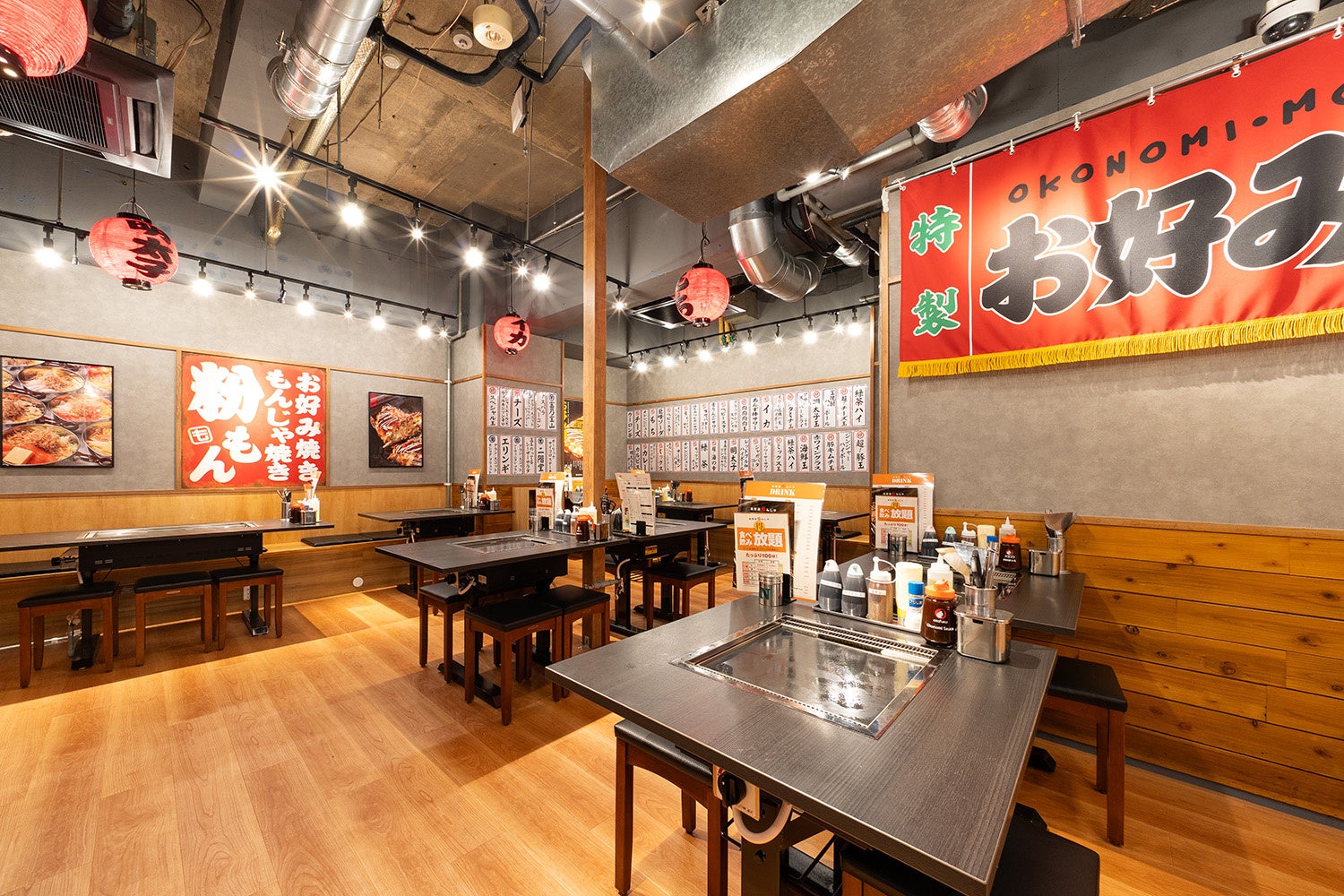 お好み焼き・もんじゃ焼きは王道の「豚玉(780円)」「海鮮玉(1,200円)」や、「ベビースターもんじゃ(850円)」「明太もちチーズもんじゃ(1,100円)」、スタッフが目の前で焼き上げるモダン焼きなど全35種を用意。さらに、鉄板焼きも30種以上の充実ラインナップ。「帆立バター(550円)」「サイコロ ステーキ(1,000円)」といった海鮮や肉の他、麺類、野菜、鉄板スイーツなどを楽しめます。ドリンクは、樽生ビール「アサヒスーパードライ 中ジョッキ(600円)」を始め、ハイボールやサワー(390円~)など豊富に取り揃えます。
