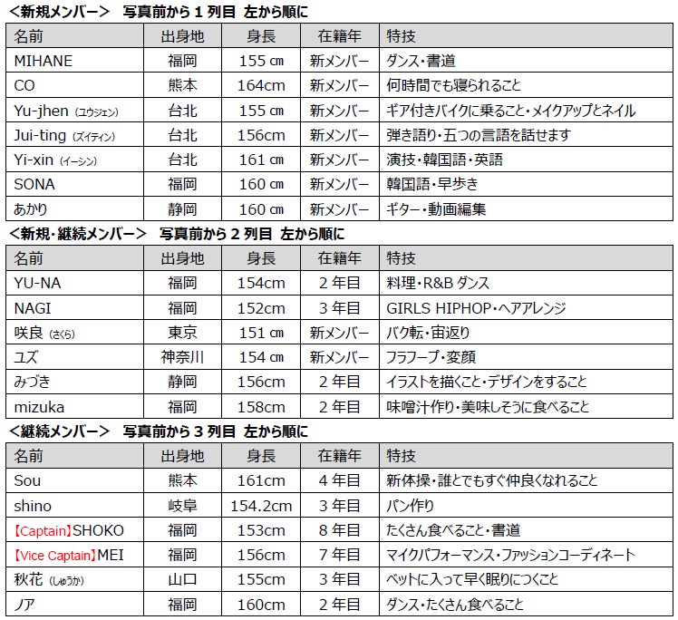 メンバーの選考にあたり、さらに進化したパフォーマンスを披露するために国内外問わず幅広くメンバーを募集することを目的に、東京、福岡に加え、球団初の試みとなる海外(台北)でオーディションを実施しました。特技披露、ダンス審査、面接などを経て、台北出身の3名を含む多彩な経歴と高い技術力を持ったメンバーが選ばれました。