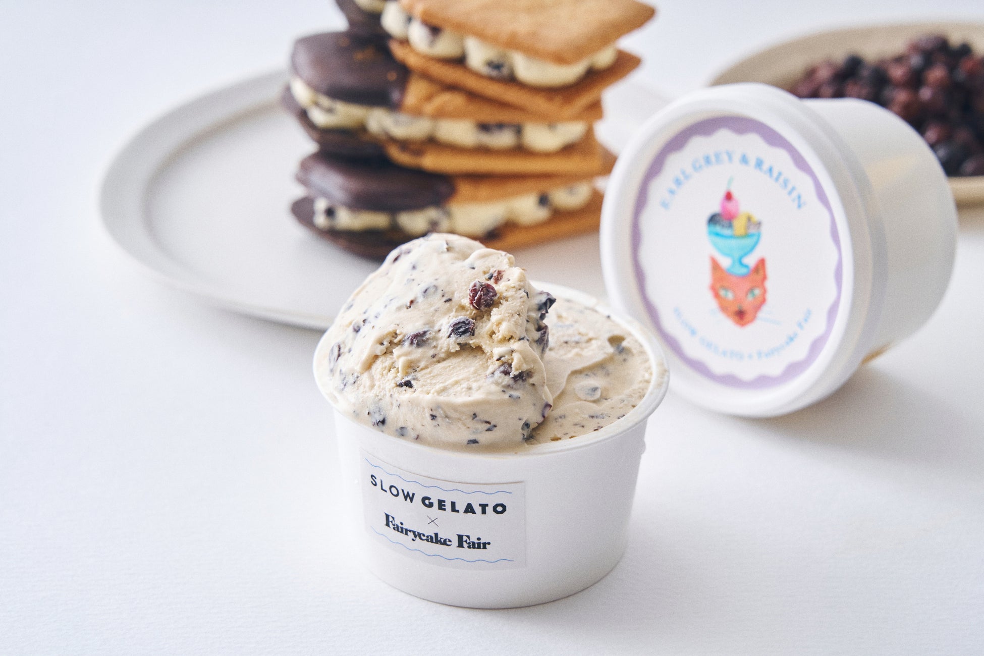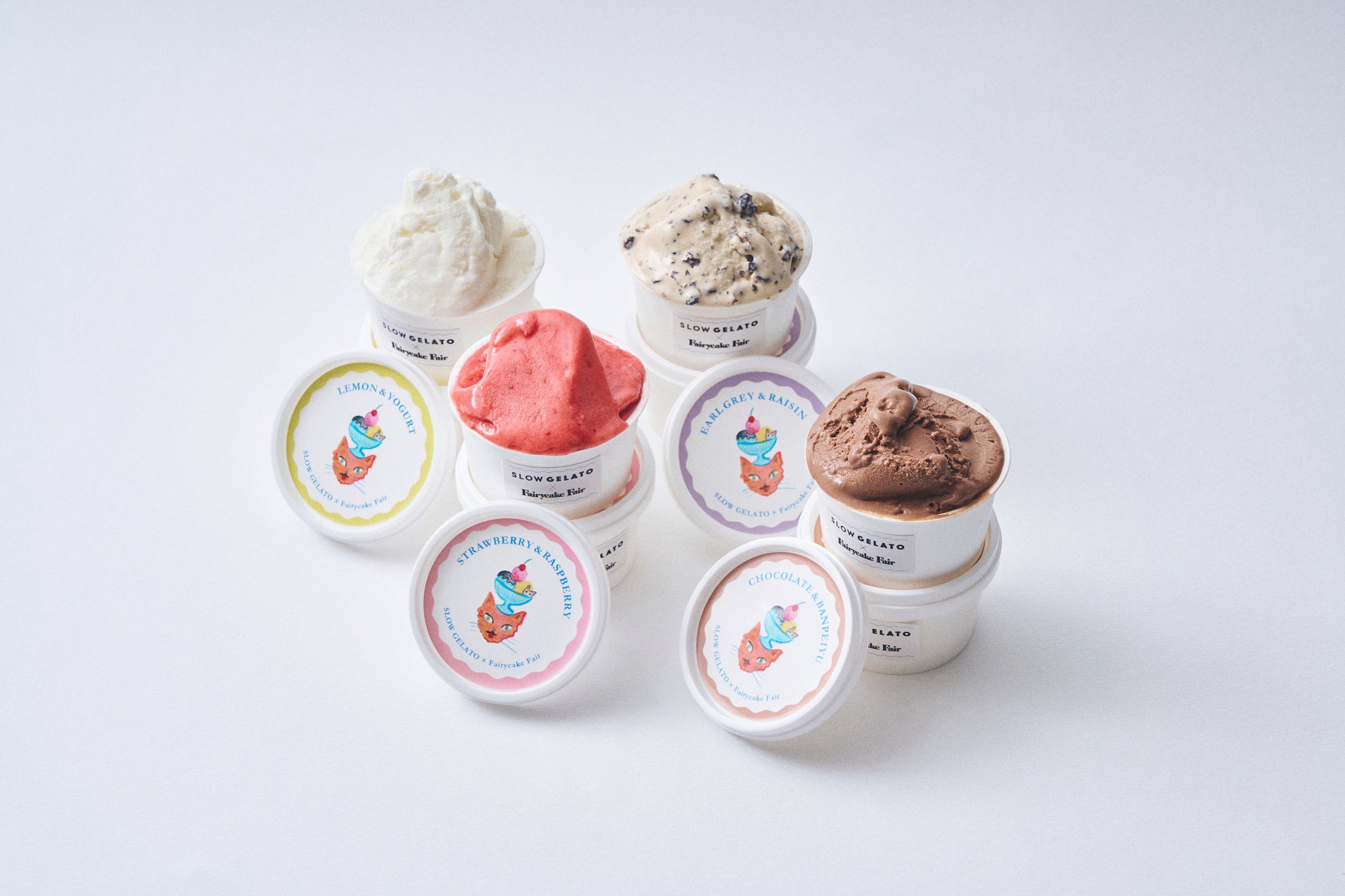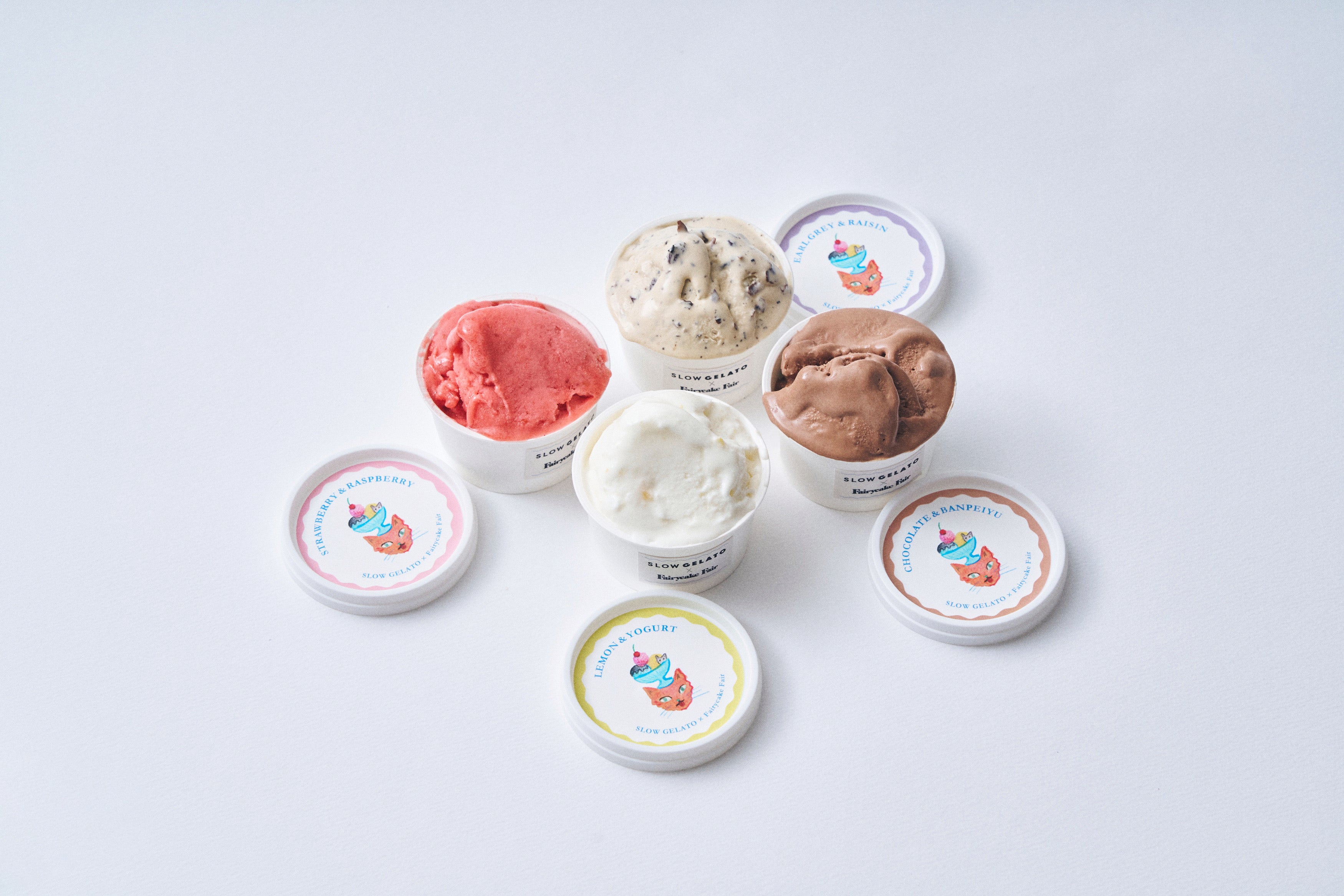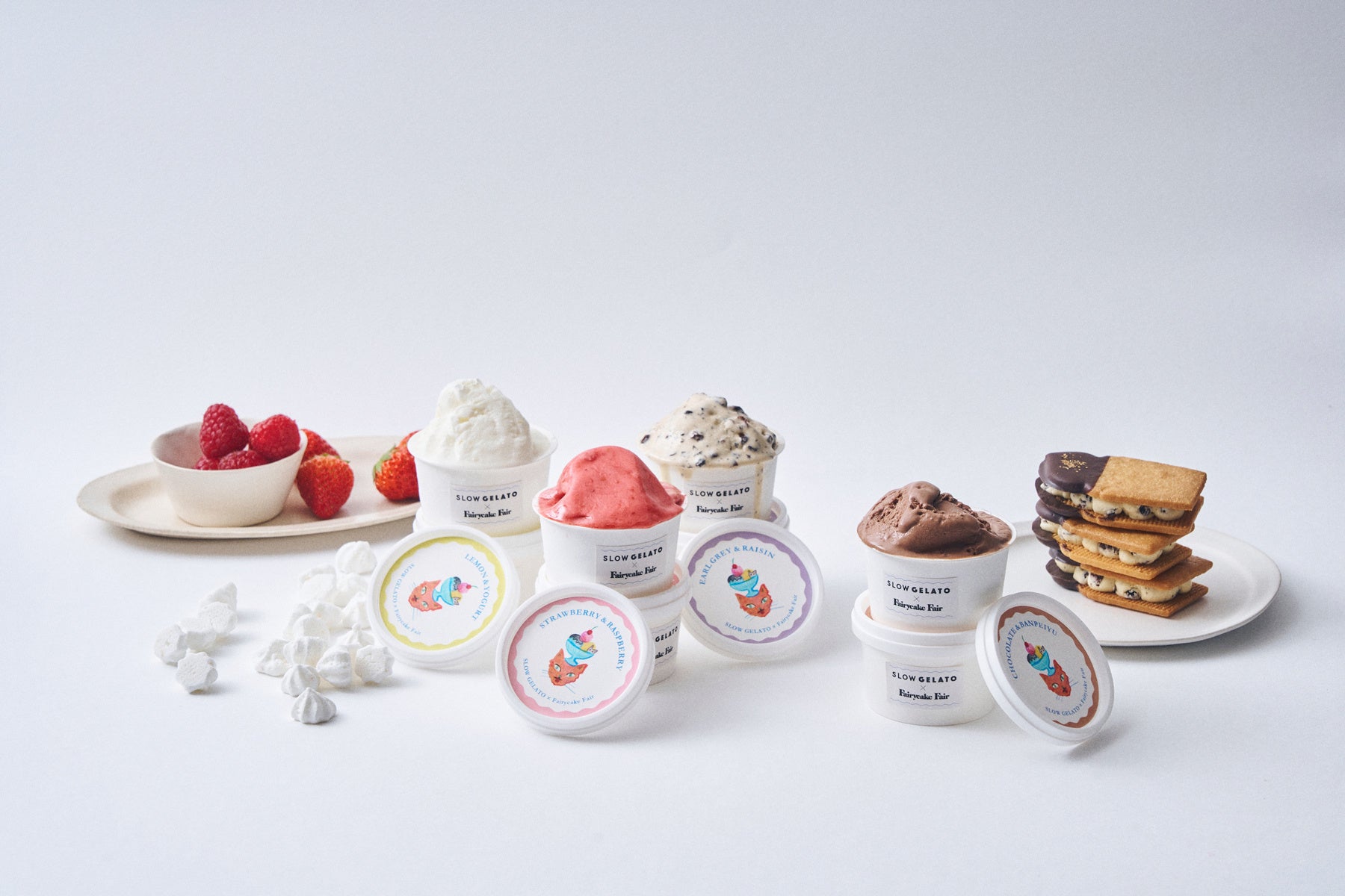 フェアリーケーキフェアの人気スイーツ3種の味わいが、夏の暑い季節にぴったりな冷んやりスイーツとなって新発売いたします。大人気『フェアリークリームウィッチ』の「レーズン生バターサンド」や隠れた人気お菓子「プチカドーはとハート “レモンヨーグルト味のメレンゲ”」などを、SLOW GELATOがアイスクリームやジェラートで表現。SLOW GELATOの人気フレーバー2種を加え、全5種のアイスがラインナップいたします。