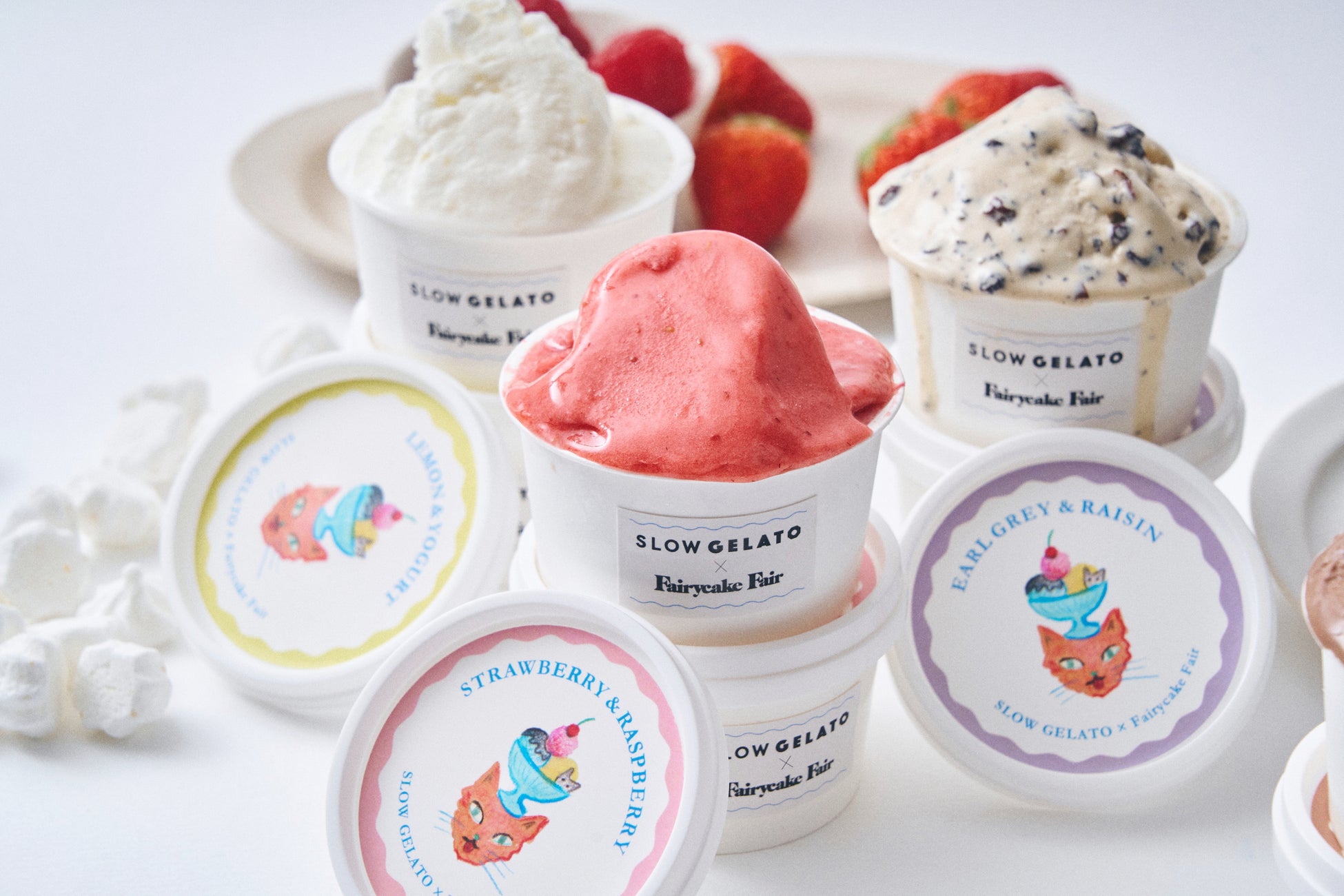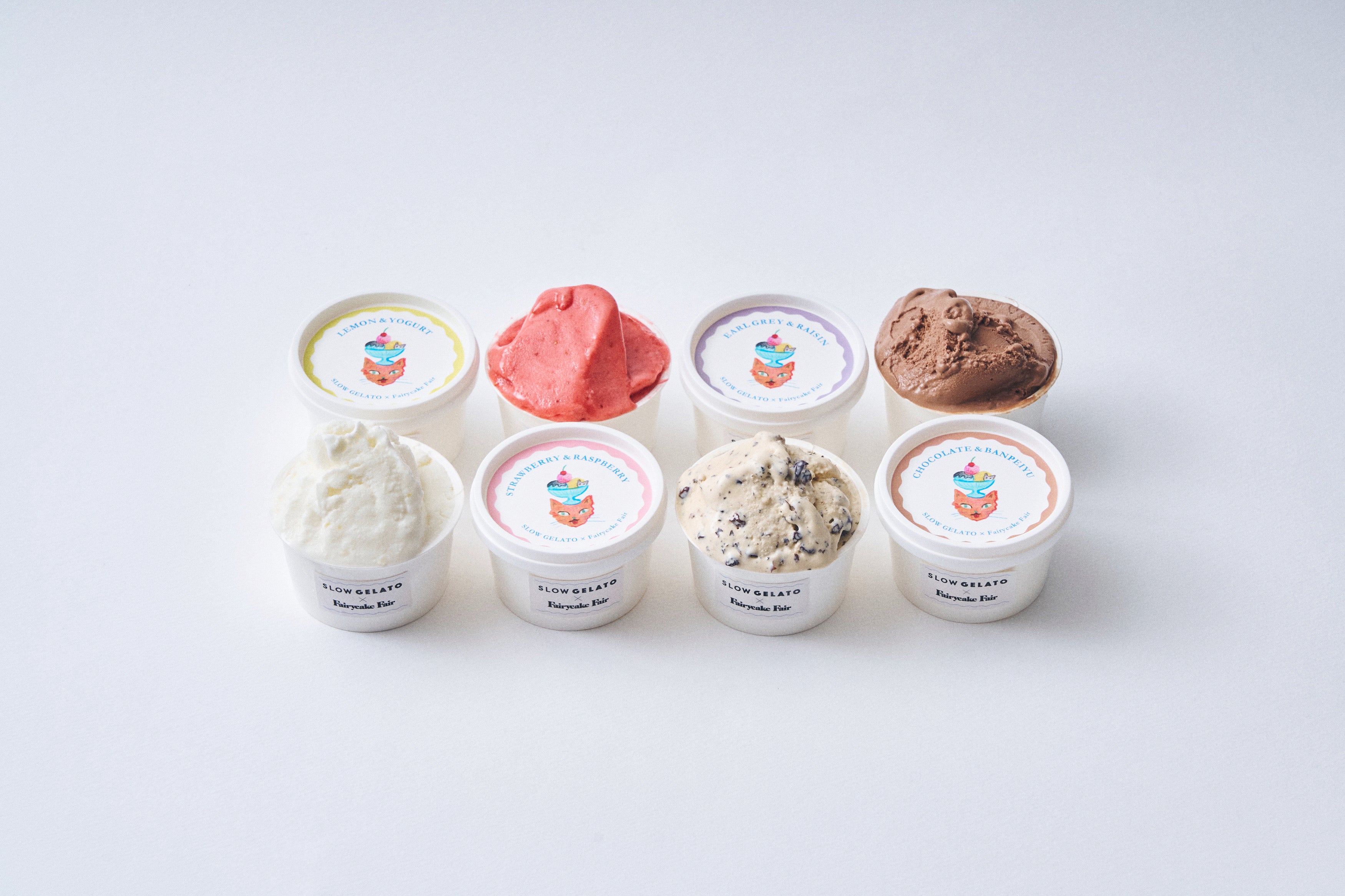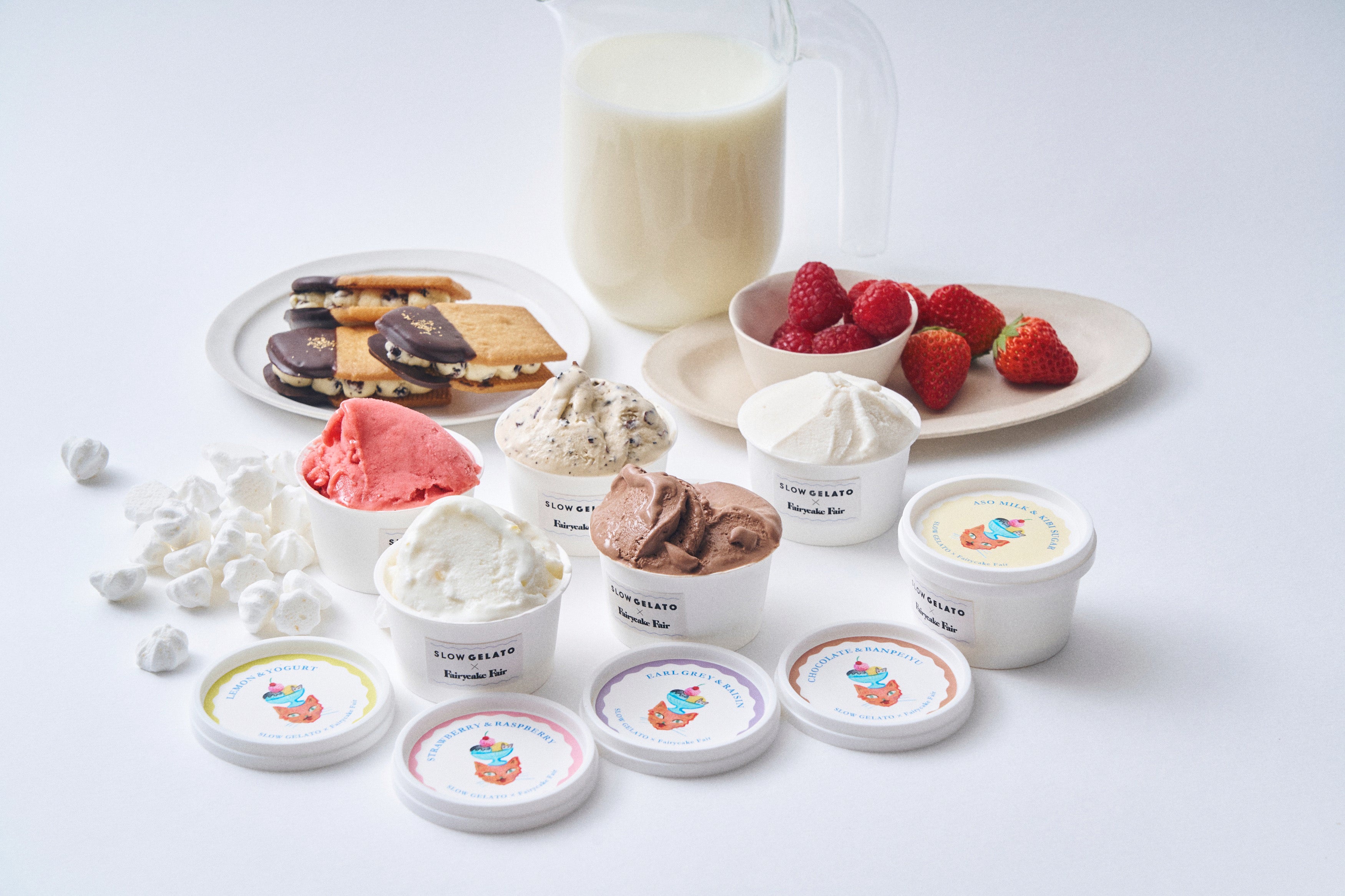 フェアリーケーキフェアの人気スイーツ3種の味わいが、夏の暑い季節にぴったりな冷んやりスイーツとなって新発売いたします。大人気『フェアリークリームウィッチ』の「レーズン生バターサンド」や隠れた人気お菓子「プチカドーはとハート “レモンヨーグルト味のメレンゲ”」などを、SLOW GELATOがアイスクリームやジェラートで表現。SLOW GELATOの人気フレーバー2種を加え、全5種のアイスがラインナップいたします。