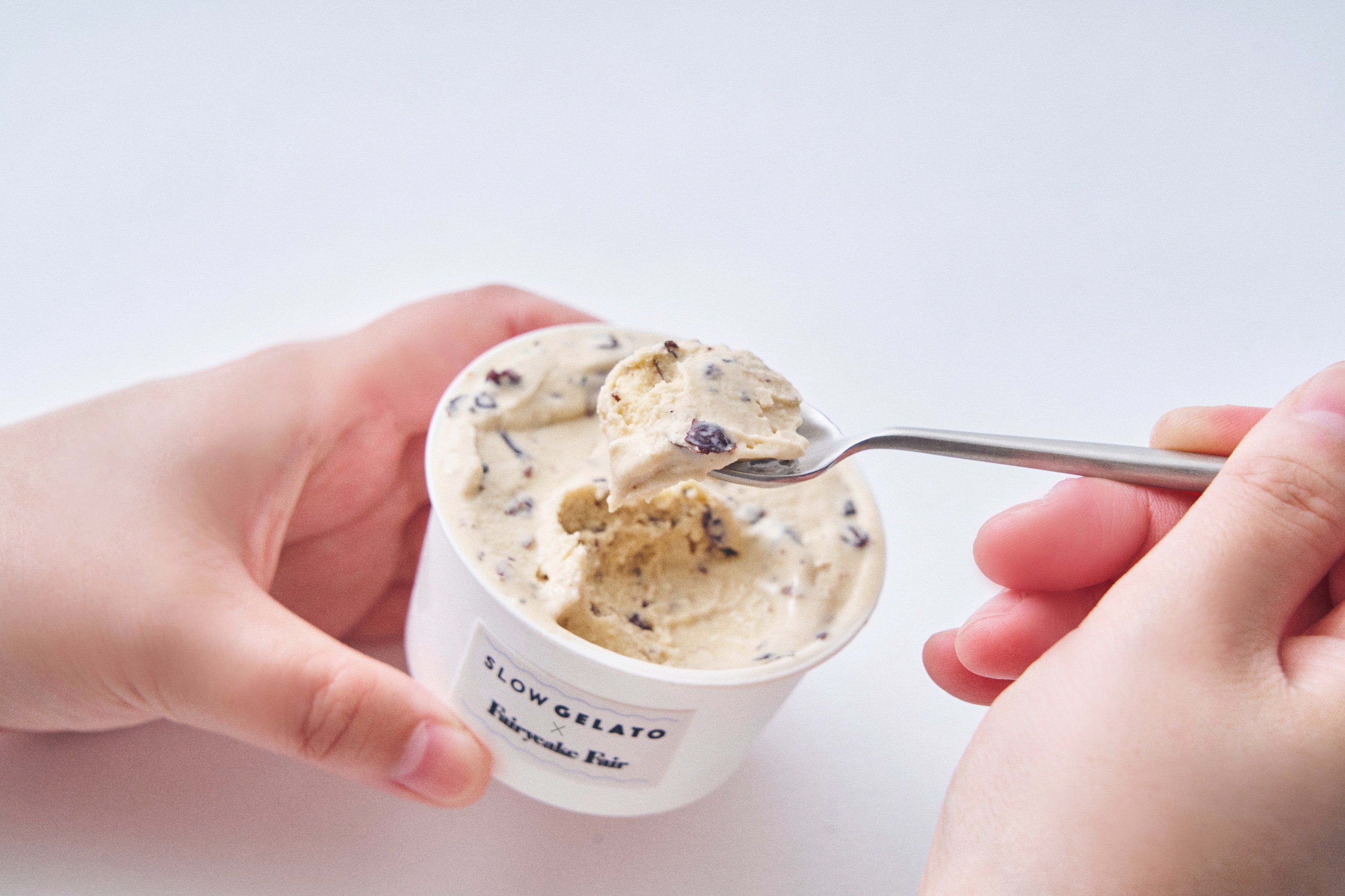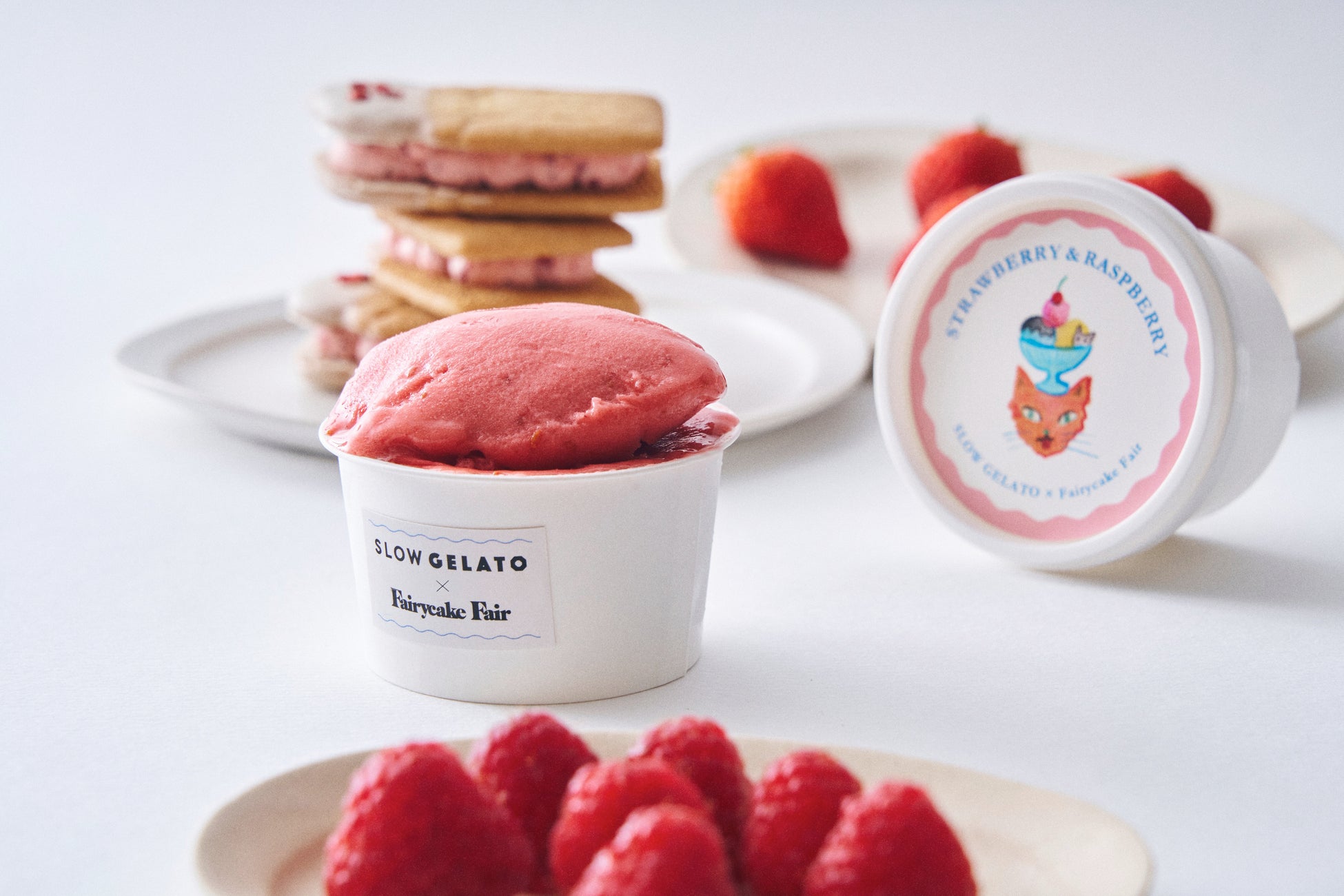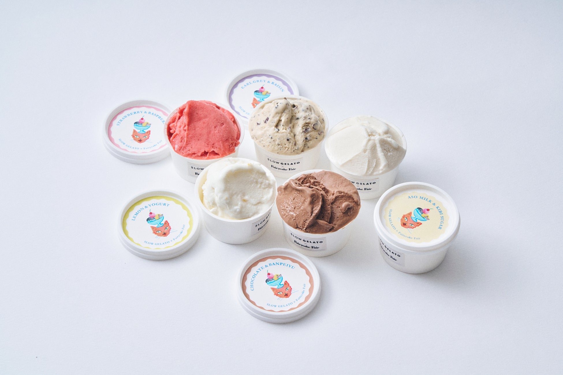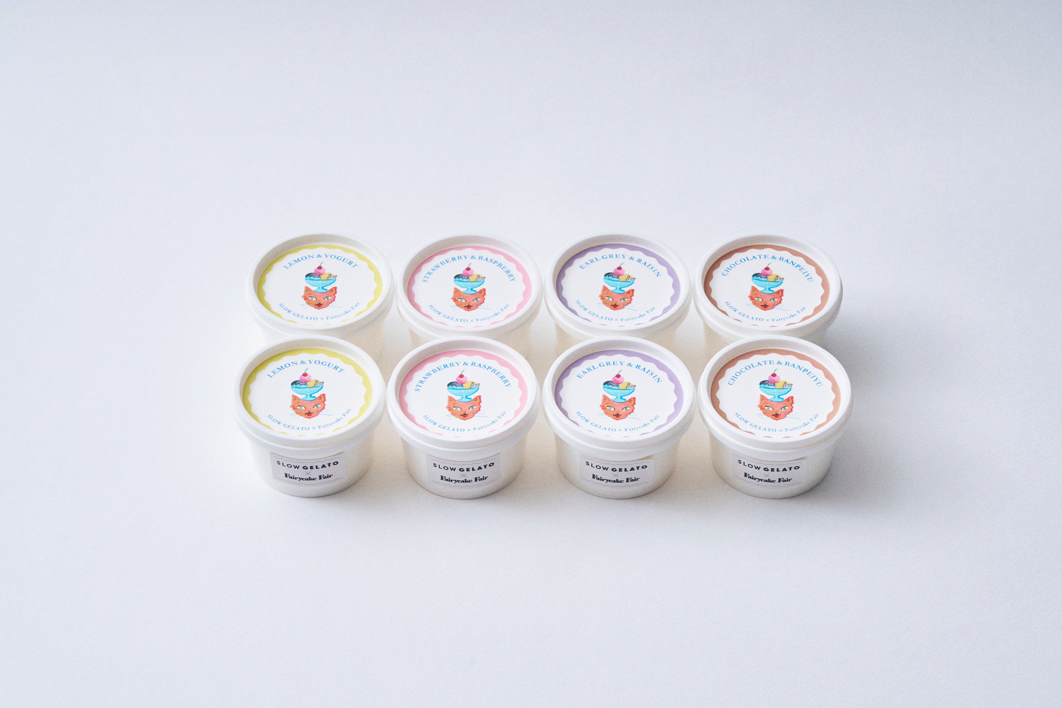 フェアリーケーキフェアの人気スイーツ3種の味わいが、夏の暑い季節にぴったりな冷んやりスイーツとなって新発売いたします。大人気『フェアリークリームウィッチ』の「レーズン生バターサンド」や隠れた人気お菓子「プチカドーはとハート “レモンヨーグルト味のメレンゲ”」などを、SLOW GELATOがアイスクリームやジェラートで表現。SLOW GELATOの人気フレーバー2種を加え、全5種のアイスがラインナップいたします。